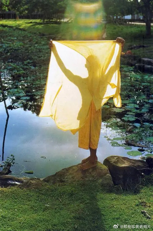 1985年,柬埔寨吴哥窟,一个穿着黄袍的和尚举着另一件袍子迎着阳光。摄影:恩斯特·哈斯