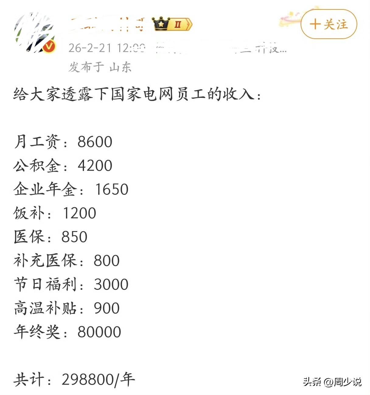 “电网员工的年薪快30万!”一博主爆料国家电网员工的收入明细,不少人看完直呼破防。明细里写得明白:月工资8600元,公积金4200元,企业年金1650元,饭补1200元,医保加补充医保合计1650元,节日福利3000元,高温补贴900元,年终奖更是高达80000元,算下来一年总收入298800元。 这事在网上传开后,瞬间引发热议。有网友酸道:“公积金比我工资还高,六险二金拉满,这待遇谁不眼红”。 也有业内人透露:“这多是东部发达地区骨干岗,基层普通员工达不到这个水平”。 还有人理性分析:“国企收入不能只看现金,公积金、企业年金这些隐形福利,才是真正的硬通货”。 平心而论,这份收入确实亮眼,周少认为却也不能以偏概全。毕竟国家电网体量庞大,地区、岗位、工龄的差异,都会让收入拉开不小差距,并非人人都能拿到近30万的年薪。 但不可否认的是,电网这类优质国企的福利体系,确实有着私企难以比拟的优势。公积金、企业年金这类长期保障,补充医保、各类补贴这类生活福利,层层叠加下来,能极大降低生活成本,给员工满满的安全感。 可见,国企的“香”,从来都不只是月薪数字,而是这份“全方位兜底”的稳定感。当然,高福利背后也对应着相应的工作要求,并非网传的“躺平就能拿高薪”。 说到底,电网的收入争议,本质上是大家对“稳定且有保障的工作”的向往。与其羡慕别人的薪资,不如看清自身需求,想要高薪还是安稳,想拼闯还是求稳妥,想明白这些,才是选择职业的关键。 对于这位博主爆料的电网员工年收入近30万,大家觉得真实吗?#寻美三湘# #周少说教育#