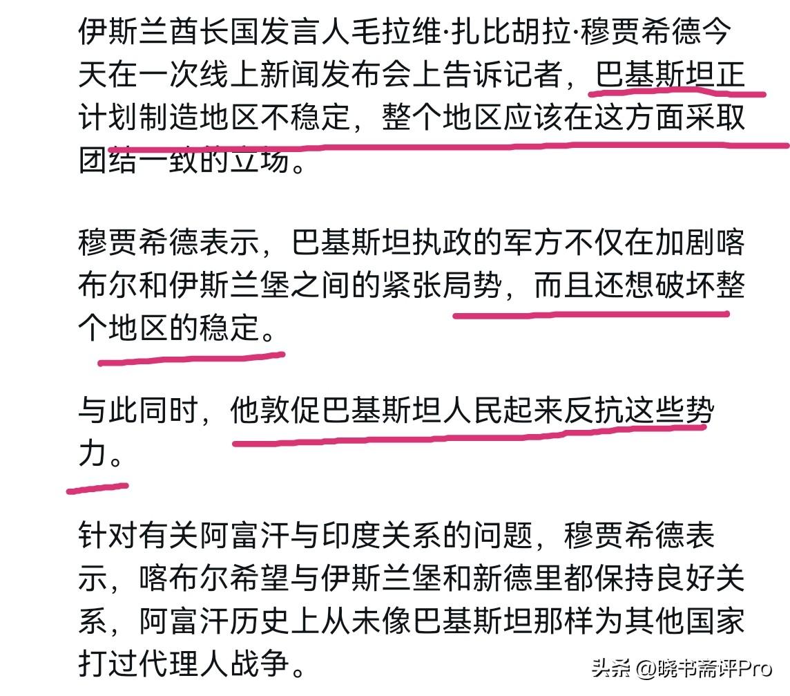 阿富汗塔利班嘴上不服软,竟然号召巴基斯坦人民起来反抗!2月28日,阿富汗塔利班发言人穆贾希德表示,巴基斯坦正在计划地区不稳定,整个地区应该在这方面采取统一立场。穆贾希德称,巴基斯坦的执政军事圈不仅加剧了喀布尔和伊斯兰堡之间的紧张局势,而且还想破坏整个地区的稳定。 他敦促巴基斯坦人民站起来反抗这些势力。穆贾希德强调称,喀布尔希望与伊斯兰堡和新德里都保持良好的关系,历史上从未有过阿富汗为像巴基斯坦这样的任何人打过代理人战争。很显然,尽管在巴基斯坦的打击下,阿富汗塔利班完全落入下风,但是阿塔嘴上的态度还很硬。 阿塔不仅认为本次冲突完全是巴基斯坦的问题,而且认为是巴基斯坦“有意”制造紧张局势,而紧张局势的始作俑者就是巴基斯坦军事指挥高层,并意图号召巴基斯坦人们反抗巴基斯坦的军事领导层。说实话,面对当下局势,从旁观者的角度而言,可以说,阿塔根本没有开始正视问题,而是在火上浇油。 两国之间的最核心矛盾是什么呢?那就是阿富汗境内长期庇护巴基斯坦塔利班武装,这才是两国冲突不断升级的根源。现在阿塔试图用煽动性言论转移国内压力,挑拨巴基斯坦内部矛盾,这当然不能奏效。阿塔恐怕只有正视反恐与边境安全的实质问题,这才有可能避免冲突走向全面战争,给紧张局势降温。