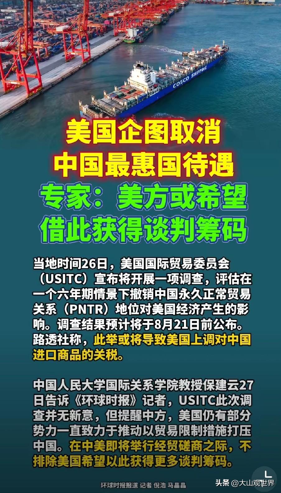 摊牌了!美国欲取消中国最惠国待遇 刚从环球网上刷到一条新闻 美国突然宣布:要评估撤销中国永久正常贸易关系。 也就是我们常说的最惠国待遇。 很多人还没意识到这事有多大: 这不是简单加税,而是要废掉中美贸易20多年的基本规则。 一旦成真,中国商品卖到美国,税率会从3%左右,直接暴涨到40%、60%,等于被拦在门外。 用大白话讲清3个真相,一看就懂 1️⃣就是来压价、逼让步的 中美马上要谈判,美国也有人想来中国访问,偏偏这时候放狠话。 说白了,就是拿贸易当筹码,想让我们在谈判里多让步。 2️⃣美国自己也扛不住,不敢真干 真取消最惠国待遇,美国老百姓买东西更贵、企业成本暴涨、农民卖不出货。 这就是吓唬人、摆姿态,真动手,他们自己先疼。 3️⃣这是在赌,不是在解决问题 美国不想好好做生意,总想靠威胁、搞限制来占便宜。 但全球贸易早就绑在一起,谁也离不开谁,硬拆只会两败俱伤。 中国态度很明确:不惹事,也绝不怕事 这是中美贸易的底线和基础,不是谁想改就能改。 我们有市场、有产业链、有底气,谈,我们欢迎;逼,我们绝不接受。 你觉得美国这是虚张声势,还是真要硬来?评论区说说你的看法! 国际