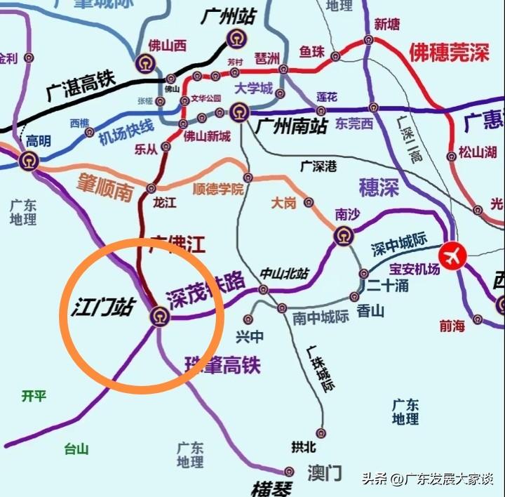 为什么说江门未来发展可期呢? 看看江门的高铁布局便知。目前,江门仅有一条高铁,即深湛铁路江门至湛江段,当然,也可通过广州城轨连接广州。 当下,江门还有两条高铁正在建设中,一条是江门到深圳的高铁,另一条是珠海到肇庆的高铁,该线路也途经江门。显然,江门已然成为交通枢纽。 一旦这两条高铁通车,江门5个方向的高铁线路便会搭建完成,分别通往广州、深圳、珠海、湛江和肇庆。其中,经深圳方向可延伸至惠州、汕尾、揭阳、汕头、福建等地;经肇庆东可接通南广贵广高铁,直达广西、贵州、云南等城市;从湛江出发,能抵达广西北海,甚至前往海口。 由此可见,江门未来的铁路交通将十分发达,大家是否看好呢? 广湛江高铁 江门 广深广湛海高铁 广深线高铁 广深广湛高铁 江门轻轨 江门2025