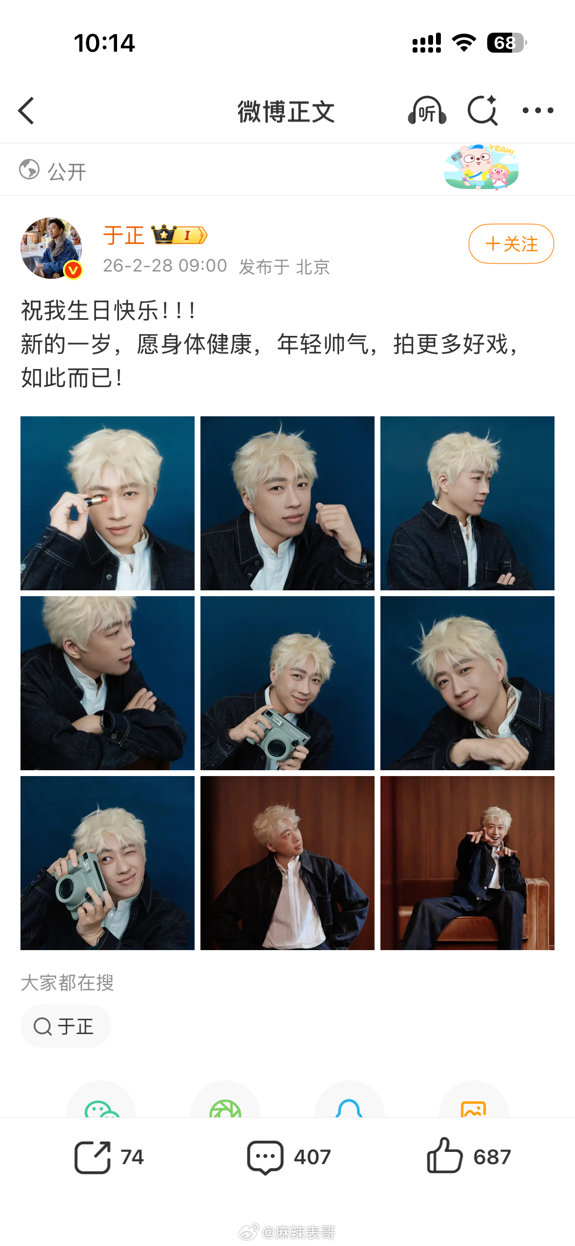 漫画里走出来的美男子于正过生日了他新岁的愿望是年轻帅气你们觉得他可以实现这个小小的愿望吗?