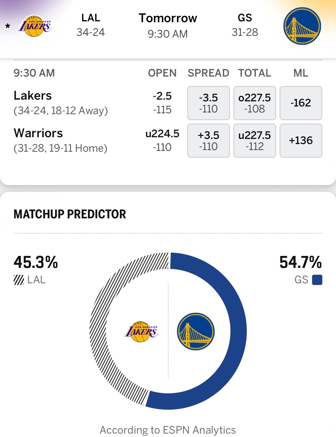 湖人明日客场9点30对阵勇士,ESPN给出获胜概率:湖人45.3%、勇士54.7%。初始指数,湖人-2.5;当前指数,湖人-3.5。湖人vs勇士