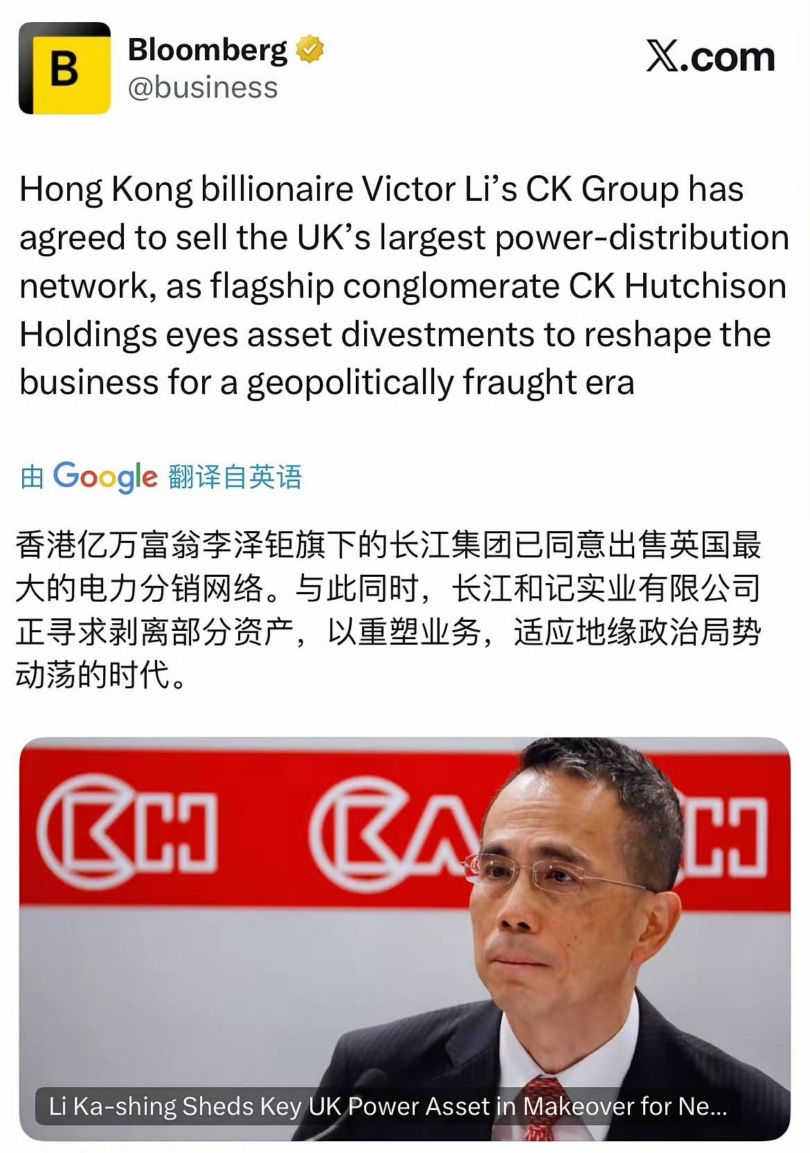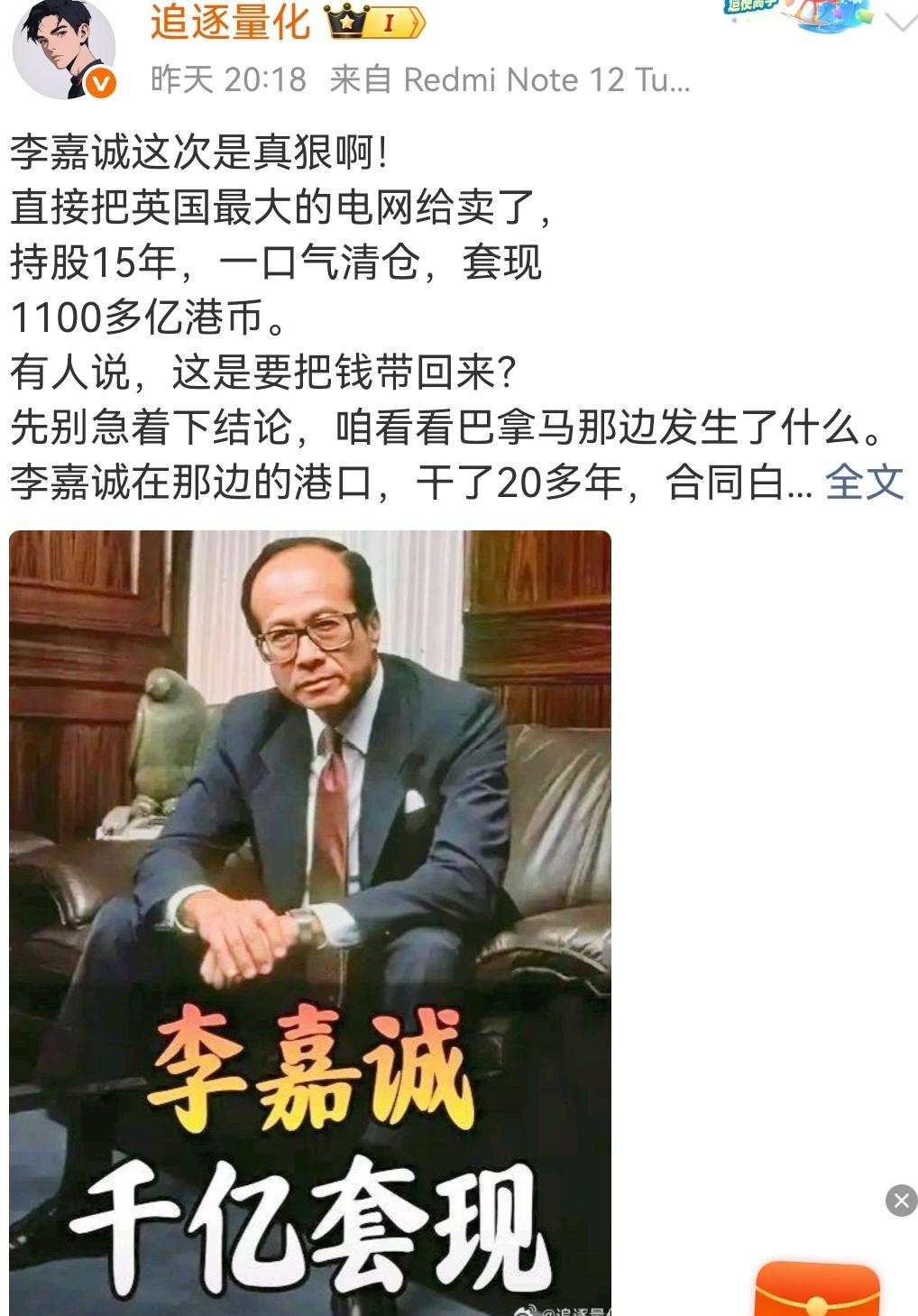 李超人家族落袋为安,卖出英国最大电网。 (如图所示)巴拿马港口被没收的前车之鉴,李超人家族卖出英国最大电网,已持有超15年。英国曾经是李家族重点投资的地区,但现在地缘和政治风险太大,不如早早落袋为安。