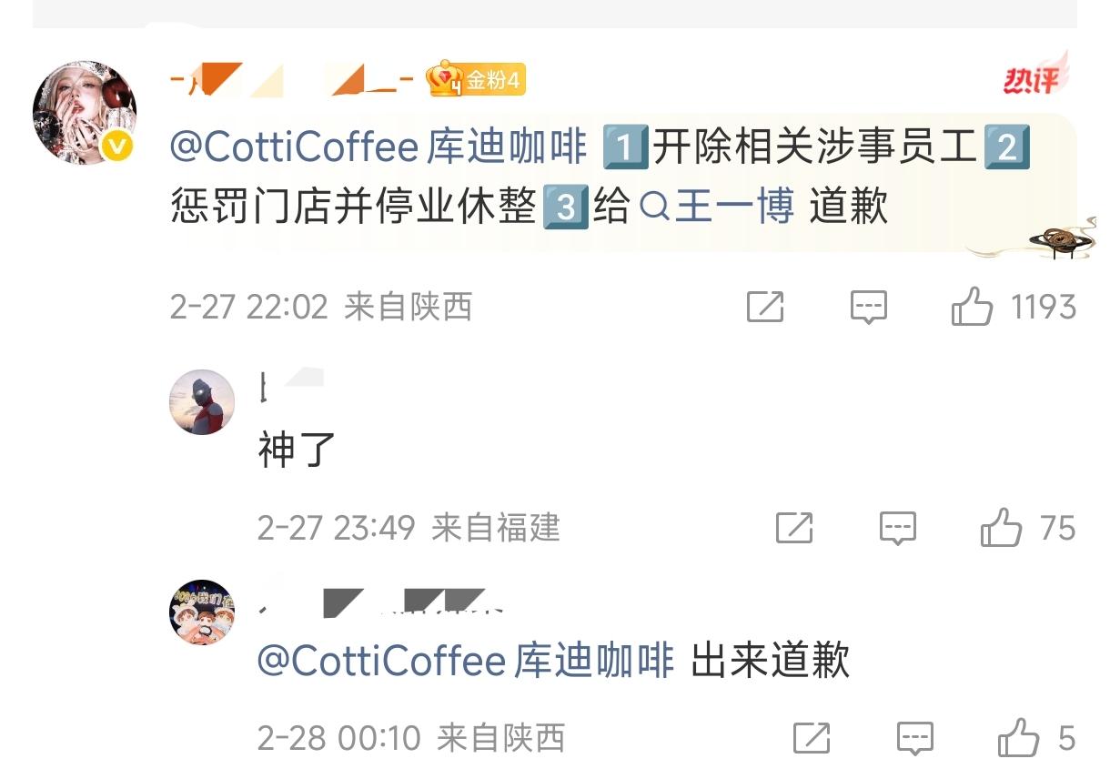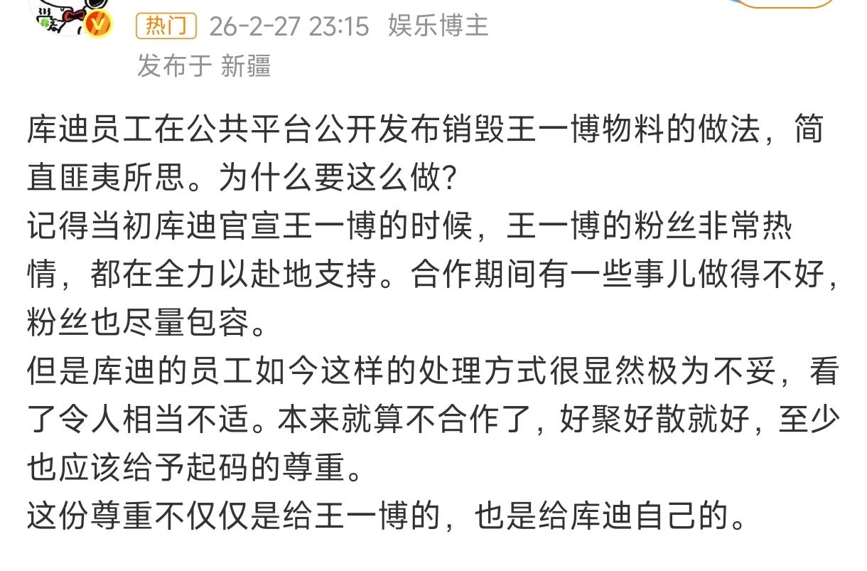 闹大了!王一博粉丝宣布,永远将库迪咖啡拉入黑名单! 因为库迪咖啡员工在处理王一博物料时,故意剪碎王一博头部,并拍视频调侃。 粉丝认为这个行为寓意不好,而且对王一博十分不尊重,要求库迪开除当事员工,将涉事门店停业整顿,并向王一博道歉。