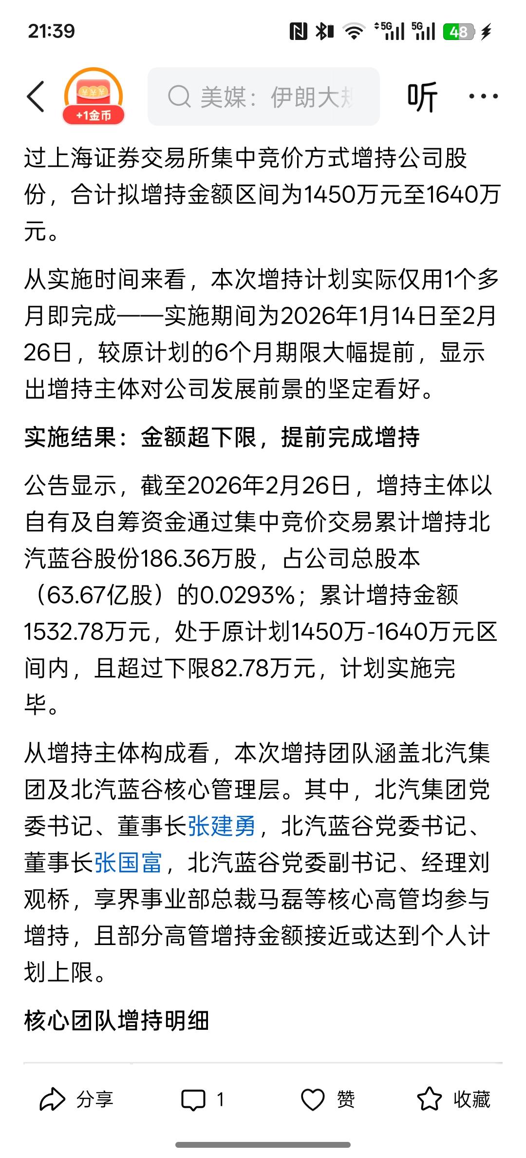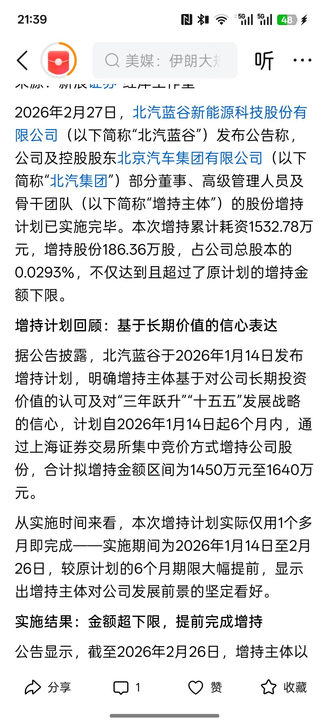 北汽蓝谷核心团队增持计划实施完毕 累计增持1532.78万元彰显发展信心,这个增持的速度非常快!之前的公布是六个月的时间内完成增持计划,这才到一个月左右的时间,北汽蓝谷的高管就已经完成了,增持计划。也就是说,在这个位置已经把仓位给建好了!对于北汽蓝谷后续发展的战略是非常有信心的!提升了投资者对北汽蓝谷的信心! 而现在的北汽蓝谷所发展战略目标是智能驾驶技术!华为合作的技术越来越成熟,推动享界品牌知名度越来越高!更是要开拓海外市场的发展!与小马智行合作的北汽极狐这个品牌也得到了市场极大的认可,而公司也将扭亏为盈!