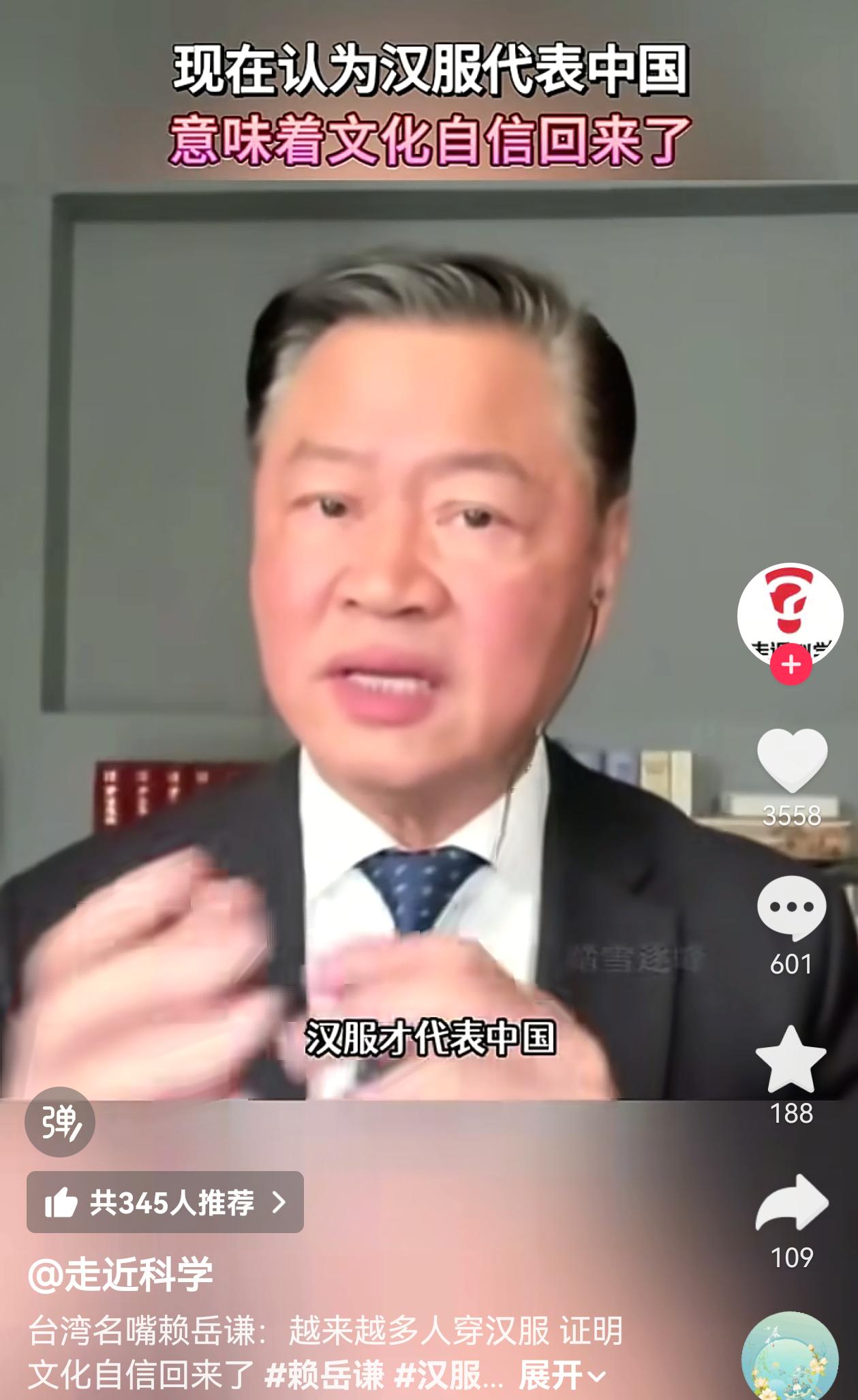 汉服这把火已经烧到了台湾! 赖岳谦的这句话说的很对, 过去被旗袍来代表中国,现在用正式汉服来代表中国,这代表着中华文化本身的自信已经回来了! 现在台湾街头也开始冒出越来越多穿汉服的年轻人了?宽袍大袖,走起路来飘飘的,路人忍不住多看几眼。 这股风从大陆刮过去,烧得特别旺,台湾知名评论员赖岳谦一看就来劲,说越来越多的人穿汉服,正说明咱们的文化自信回来了。 他这话戳中人心,过去一提中国代表服饰,好多人脑子里先跳出旗袍,现在换成正宗汉服,这转变多明显啊,背后就是民族底气越来越足了。 汉服这东西说起来历史可长了,从古时候的华夏衣冠开始,历朝历代都有自己的样子,周朝的深衣、唐朝的圆领袍、宋朝的襦裙,明朝的对襟衫,每一件都藏着礼仪和审美。 清朝那会推行新规矩,很多老传统断了线,大家穿的慢慢变了样,改革开放后日子好过了,年轻人手头有钱,心思也活络起来。 2003年前后,网上零星有人翻古书、看古画,琢磨着复原那些老衣服,自己买布料缝一缝,拍照片发出去。 没想到一传十十传百,越来越多同龄人跟风加入,抖音上搜汉服,播放量轻松破百亿,大家周末就穿出去逛公园、拍视频,成了生活里的一道风景线。 穿汉服不光图好看,更能带你钻进历史里,比方说袖子宽窄代表啥朝代,颜色搭配有什么讲究,腰带怎么系才能显出身段,这些细节一研究,就跟上了一堂活生生的文化课。 年轻人本来对老祖宗的东西有点生疏,现在穿上身,感觉自己跟过去连上了。 商家也跟上节奏,做出轻便版,布料透气不皱,适合上班族日常穿。 结果汉服从爱好变成产业,全国到处是汉服店、汉服节,经济数据亮眼,带动了布料、配饰、手工艺一大堆活。 这把火怎么就烧到台湾去了?其实台湾那边起步晚点,大概2010年左右才有小圈子爱好者,受大陆古装剧、社交平台视频影响,不少人从电视剧里看到漂亮衣服,就好奇起来。 慢慢地,他们自己组织活动,2020年在台北西门町搞了个小聚会,一开始才一百来人,大家穿汉服逛街拍照,玩得开心。 谁知道越办越大,到2024年台湾汉服节,主题叫“华夏衣冠,辰龙衮冕”,光踩街游行就破千人! 黑袍武士腰挎长刀,广袖文士摇着扇子,金冠淑女裙摆飘飘,西门町闹市瞬间变古风现场,行人停下脚步拍照,问东问西,现场流量直接冲到三万人。 参与的人可有意思了,有学生、有上班族,还有专门做配饰的“簪娘”。 像钟悯豪这样的铁杆爱好者,家里藏了五十多套,从汉唐到宋明全试过,他说汉服不是戏服,更不是角色扮演,而是实打实的民族传承。 许雅晴平时把汉服跟T恤混搭,马面裙配衬衫,走到哪都科普几句。 蔡景如他们团队用台湾传统缠花工艺做簪子,颜色花样创新,红金为主却不死板,戴在汉服上特别搭。 她觉得这股热不光是年轻人找独特打扮,更是文化觉醒的表现,发起人林士民当初就几个朋友突发奇想,周末穿出去玩玩,结果现在规模这么大,他自己都感慨。 赖岳谦不光在节目里点评,他自己也身体力行,去年他和太太去重庆参加一场古风礼宴,两人穿上传统服饰,现场听曲子、看舞蹈、品菜肴,按老规矩走流程。 他直说感觉自己成了古代文人墨客,时空穿越感特别强,这宴会把汉服文化、饮食礼仪全串起来,让他深深体会到中华文明的根有多深。 赖岳谦这话一出,台湾那边不少人点头,说过去代表中国的服饰总被旗袍占位子,现在汉服正式站出来,说明大家对自家文化的认识更到位了,不再局限于外人眼里的印象。 汉服火到台湾,带来的变化实打实,两岸年轻人多了一个共同话题,以前隔着海峡聊得少,现在穿同样样式的衣服,聊起历史就亲近了。 台湾爱好者会去大陆西塘汉服周交流,学到更多复原技巧;大陆这边看到台湾的创新配饰,也觉得新鲜。 文化交流就这样自然发生,不用刻意安排,穿汉服还带动了手工艺复兴,像花簪、绣花、配饰,这些老手艺在年轻人手里活起来,网上卖得火热。 节日里大家穿汉服祭祖、逛博物馆,端午中秋春节全用上,传统习俗就这么一代代传下去。 过去有些人担心传统文化离年轻人太远,现在一看,汉服成了桥梁,把历史和当下连得牢牢的。 台湾那边也一样,年轻人从“奇装异服”的眼光,慢慢变成主动参与,说明文化魅力跨海峡一样管用。 想想看,这变化多有意思,经济起来了,民族自信心跟着涨,穿衣服的选择就从跟风别人变成亮出自家宝贝。 汉服这把火不光烧在大陆,还烧到台湾,证明中华文化不管在哪里,都能找到共鸣点。 年轻人学着做衣服、查资料、办活动,过程里不知不觉就多懂了历史,多爱了根脉。 文化传承本来就该这样,靠大家穿在身上、记在心里,而不是只留在书本上。 这股汉服热潮让两岸年轻人有了更多文化共鸣,也展现出中华优秀传统文化的强大生命力。 我们要好好传承这些宝贵财富,让它在新时代焕发光彩,为实现文化强国贡献力量。