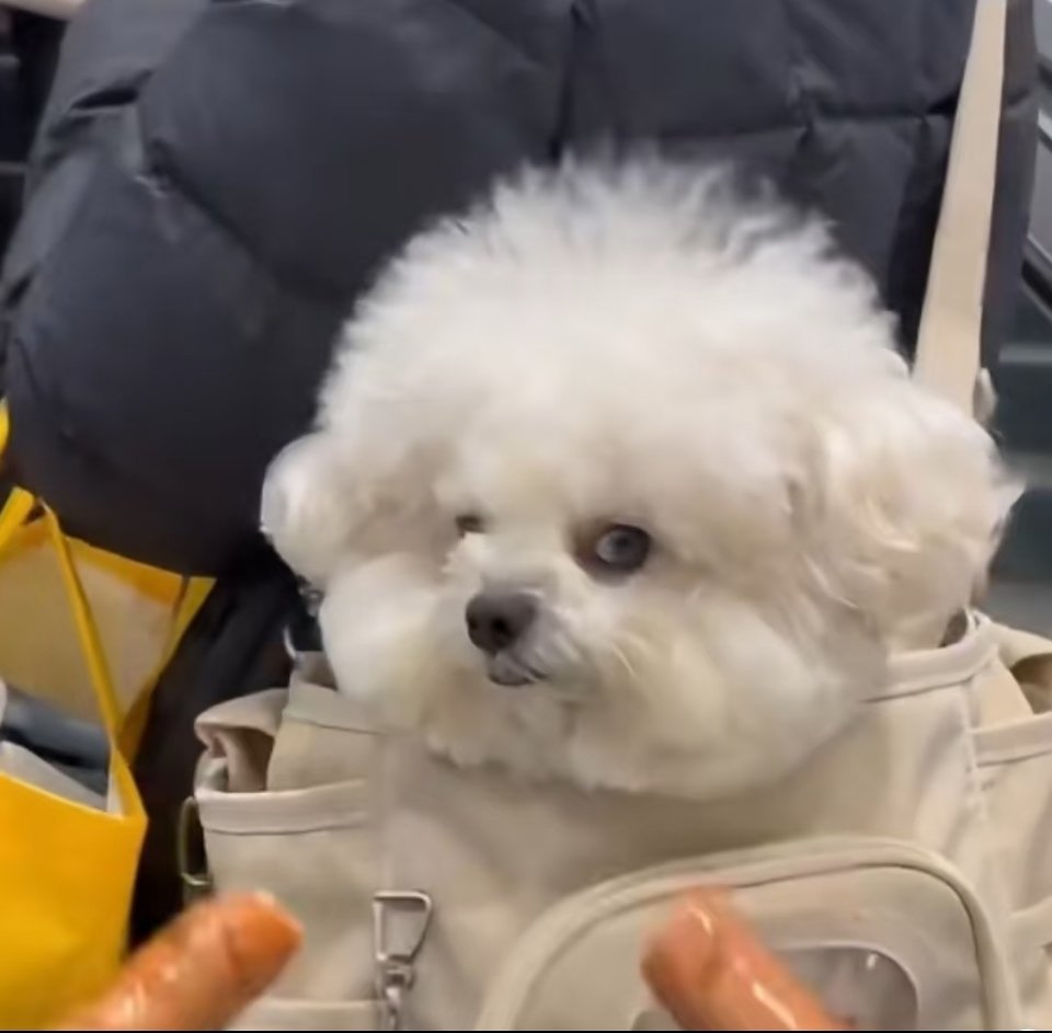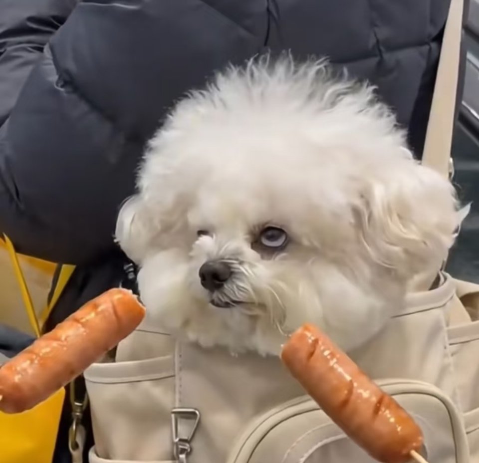 拿烤肠逗前面小姐姐背包里的小狗,它居然翻了个白眼