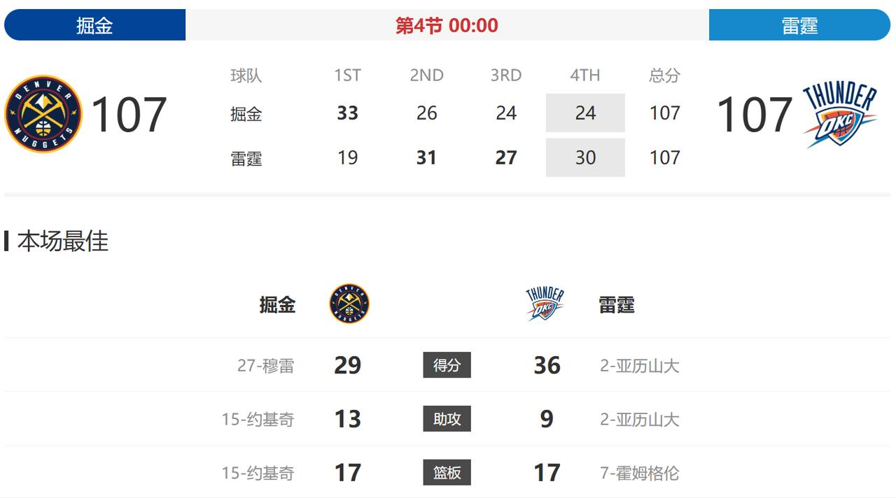 怎么又打到加时了? 今天咋回事?是有什么加时赛的KPI要完成吗?一共就看了两场比赛,结果都打到加时了。先是上午骑士跟活塞的比赛,从早上八点开始,一直打到了十一点半,各种比赛中的暂停、回放不说,就连活塞的主场音响都出问题了,让比赛中断了一段时间…… 说回雷霆和掘金的比赛,今天正好赶上了亚历山大的复出,“罚力”依旧,就算投篮不准还是能欻欻得分。 唉,掘金的阵容深度比雷霆差远了,打到现在约老师和穆雷都已经打了40多分钟了,现在拖到了加时,又是在雷霆的主场,感觉对掘金更不利啊