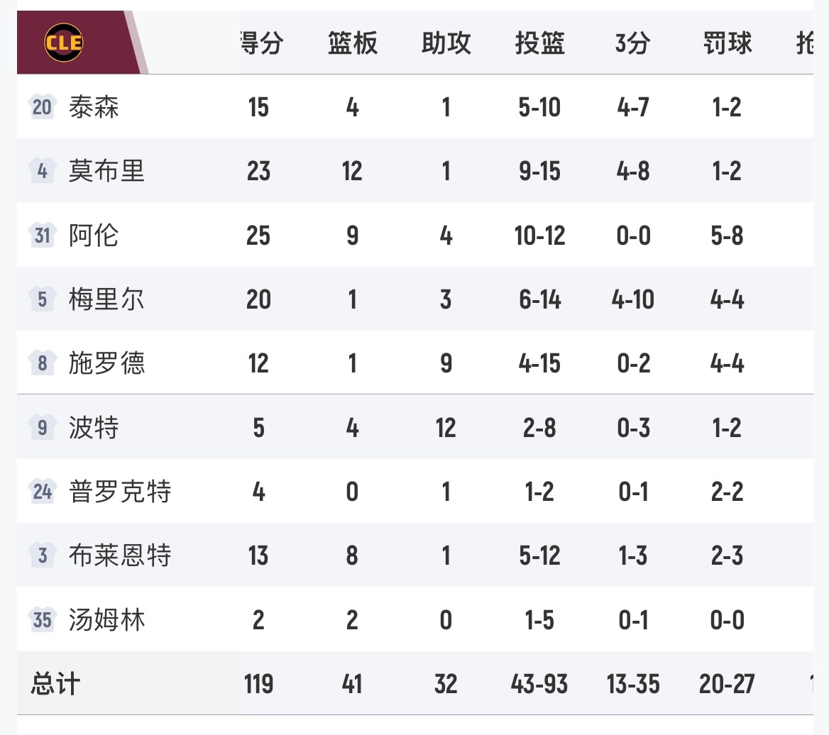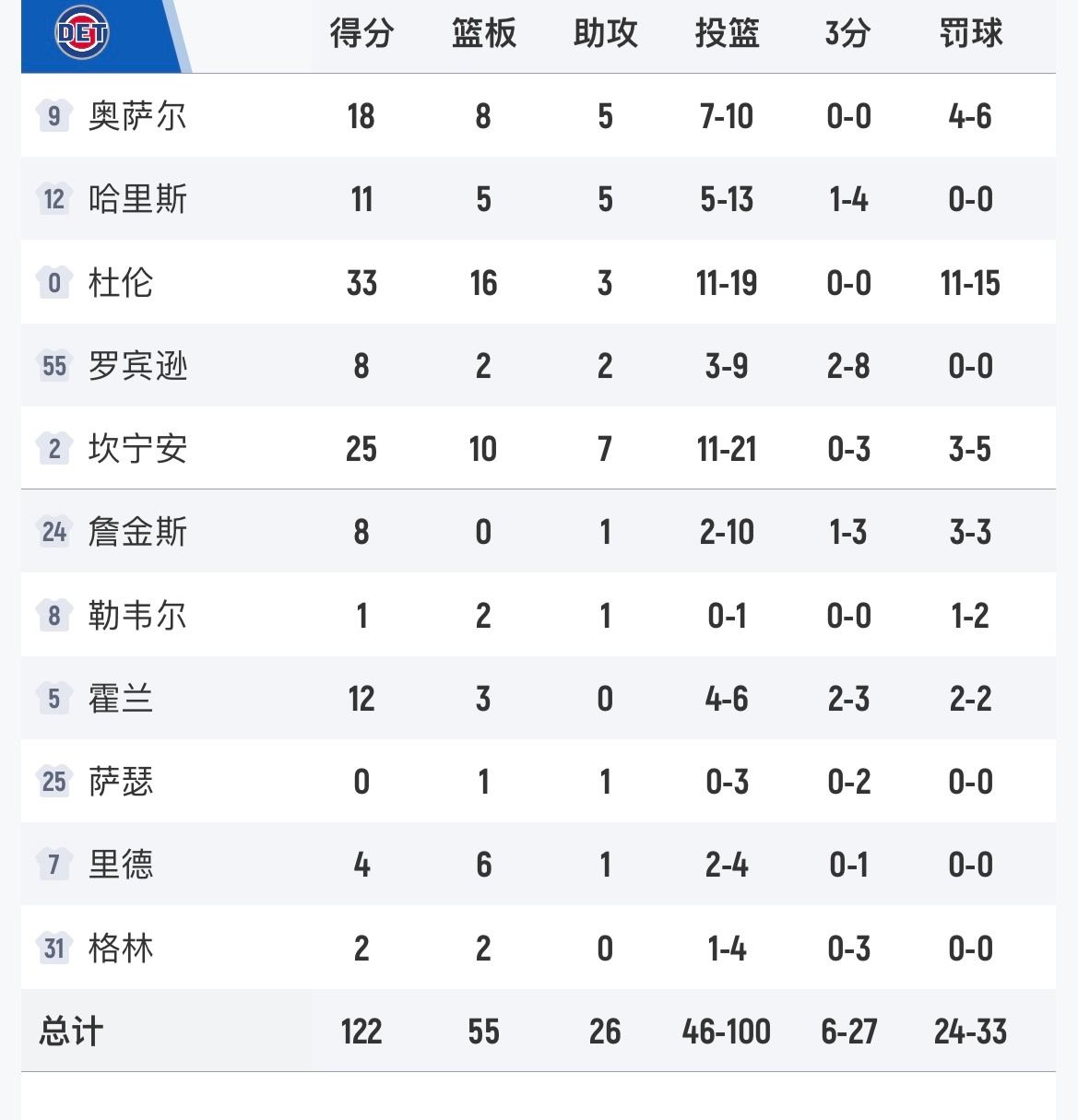 骑士加时客场119-122不敌活塞。阿伦25分9板4助、莫布里23分12板1助4帽、梅里尔20分1板3助2断。杜伦 33分16板3助3帽、坎宁安25分10板7助2断、奥萨尔18分8板5助2断骑士vs活塞