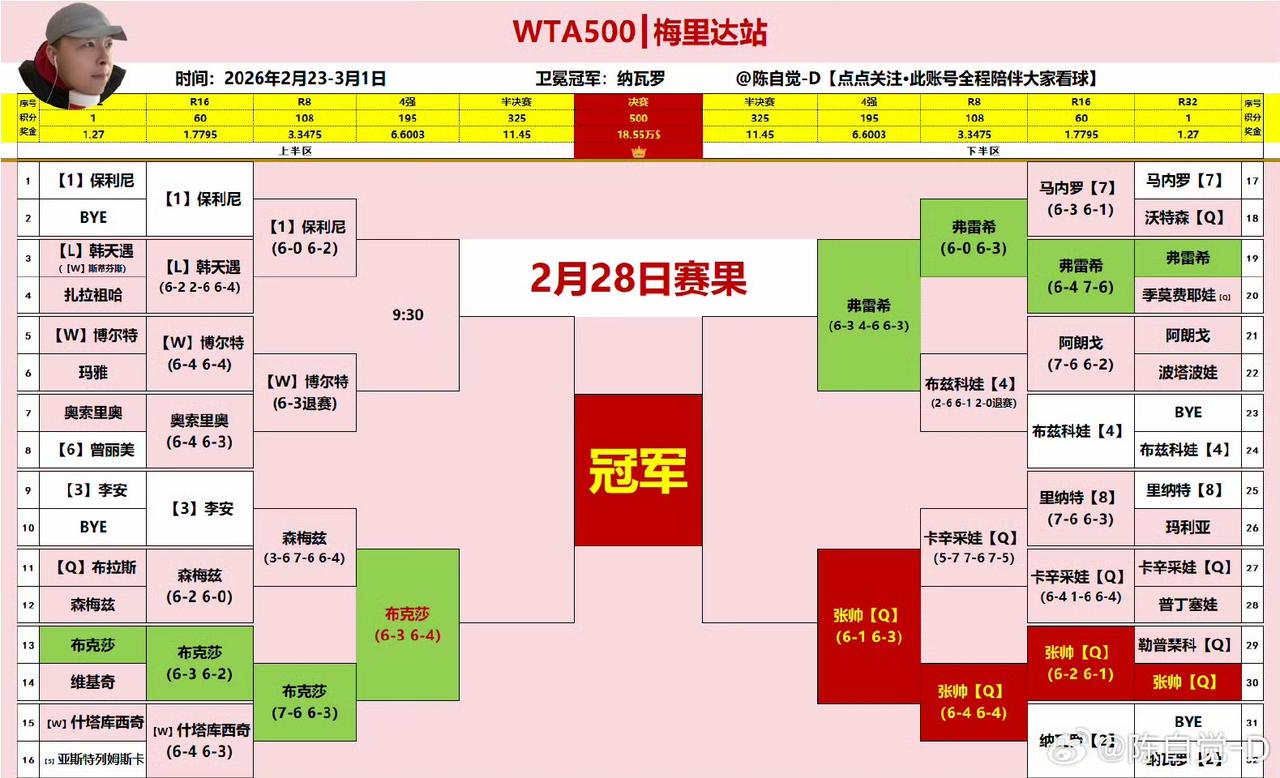 恭喜帅姐横扫晋级梅里达女单四强!收获220分、66003美元,即时排名来到62名。37岁了还能打进500赛四强,牛逼! WTA梅里达1/4决赛,张帅6-1/6-3完胜希门尼斯,职业生涯第三次打进500赛四强。(2014伯明翰、2022东京)