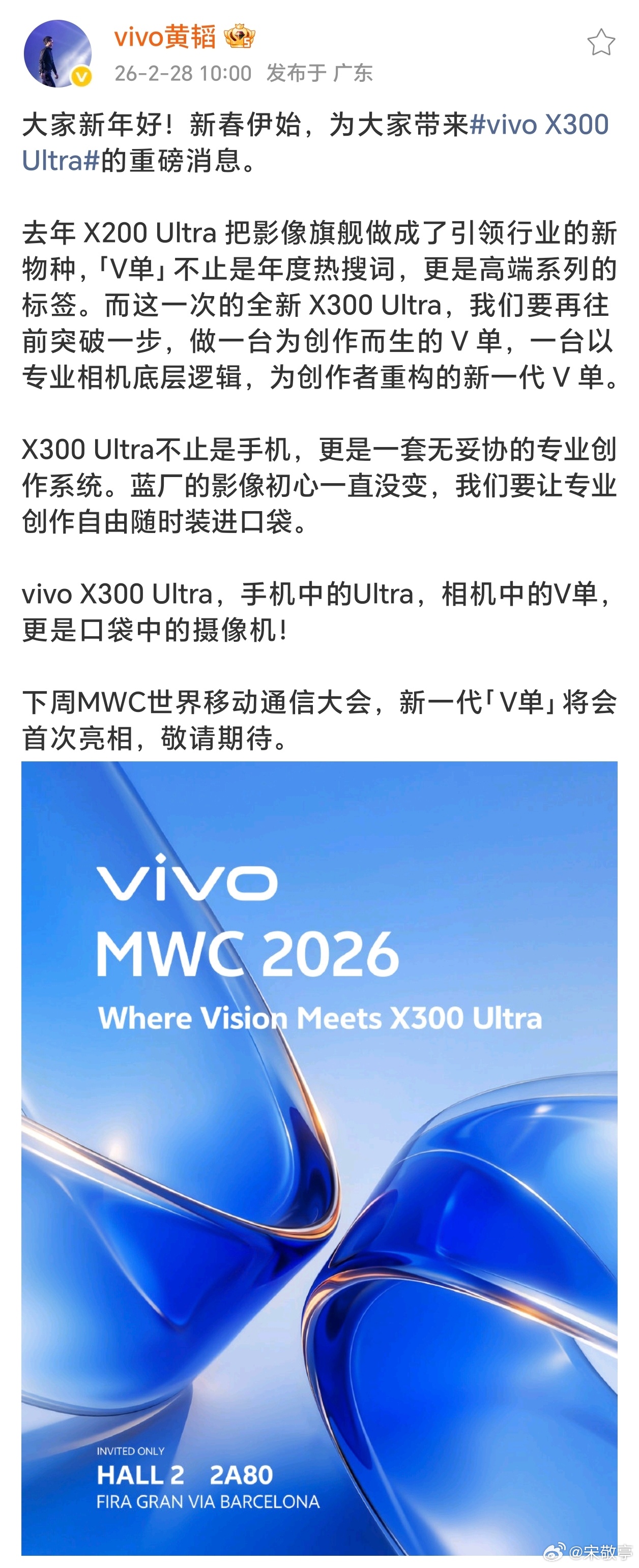 把V单直接装进口袋,影像创作直接拉满,影像旗舰X300 Ultra这次也直接MWC亮相了,狠狠期待一波~