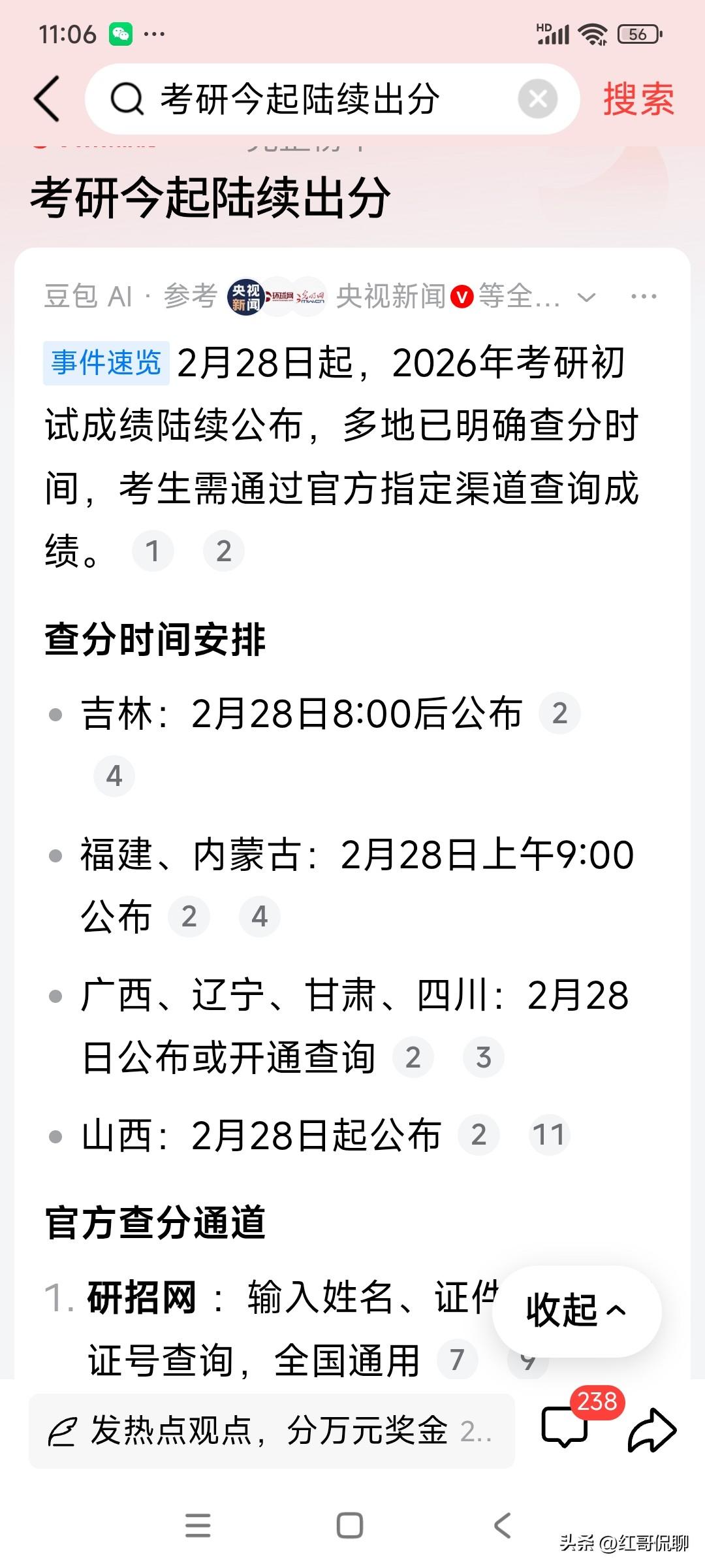时间真快,一年又一年,今天看见又到了研究生查分时间,也不由得想起姑娘21年考验查分的心态,忐忑不安,心跳加速,估计姑娘当初更紧张,只是她在自己屋里查,我在外边假装镇静等,快不快,姑娘已经毕业工作两年多了,感慨一下:考研虽不及高考那么引入关注,但对很多孩子也是很好的一次二次选择的机会,也是几个高考大省学生重新走进心意大学的二次机会,不是说现在考研有多么必须,但的确它已经成为很多单位的选人用人必须,这个不要吐槽,只是自然规律,世界哪里都一样,虽然我哪个年代研究生可谓超稀缺资源,但今天研究生已经成为社会的必需品,时代发展了,竞争激烈了,很多人鼓励越年轻创业,但我的经验没点真玩意创业真是不太容易,有机会多学点东西踏实,其实现在很多大学里研究生已经以项目为学习重点,其实对创业也不耽误,哈哈,似乎扯的有点远了,最后还是祝学生们查个满意的答案,顺带一提,分过了,现在很多大学面试占比也不小,淘汰率不能掉心,提前准备哟[呲牙]
