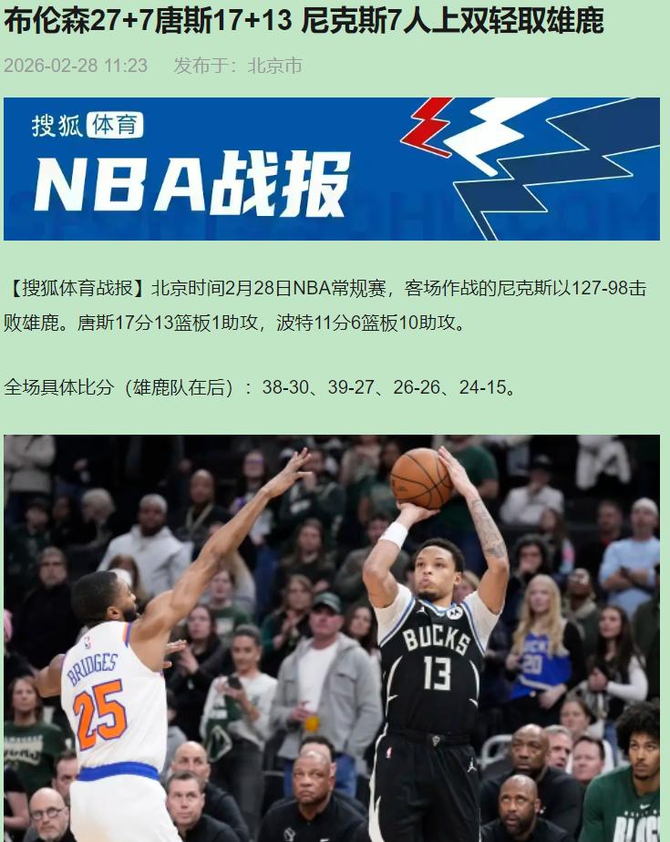 赢29分就把尼克斯吹上天?我看完直接关直播。这不是什么史诗大胜,这是一场照妖镜比赛——把雄鹿的伪强队底色,照得一清二楚。 你看哈特那15个前场篮板,活像饿了三天的狼看见肉,每一个都往死里磕。OG那个抢断劈扣,雄鹿替补席眼神涣散得,我都替他们尴尬。布伦森27分拿得轻松,唐斯在内线翻江倒海——但最离谱的,是雄鹿让尼克斯半场轰下77分。防守轮转慢半拍,沟通全靠眼神,回防速度比我家楼下大爷遛弯还慢。 讲真,别说这是雄鹿缺了字母哥和利拉德。 真正的强队,防守基本盘是刻在DNA里的。你看凯尔特人,缺了塔图姆照样能靠体系锁死对手。雄鹿呢?核心一缺阵,特纳和库兹马数据刷得漂亮,正负值惨得没法看,全队助攻比尼克斯少10次,球根本转不起来。这就是典型的硬解能力不足,体系还脆得像纸。 说白了,尼克斯今天展示了顶级的防守弹性和对位资源,这是争冠的底牌。但别飘,三分命中率刚过三成,进攻太依赖布伦森的持球发起,空间属性拉不满。这毛病遇到纪律严明的防守强队,立马现原形。 雄鹿这场输得难看,恰恰暴露了轮转深度和防守韧性的双重缺失。到了季后赛,人家就抓你这点打。 最后抛个灵魂拷问:尼克斯这防守资源确实能横着走,但手里的牌打完了,后面的硬仗怎么出?雄鹿这体系到了高端局,又能走多远?两边都得回去好好想想,真正的考验,现在才开始。布伦森27+7唐斯17+13 尼克斯7人上双轻取雄鹿