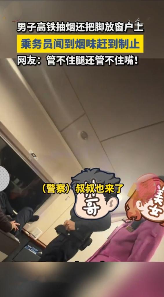 气人!高铁上这操作太离谱了——2月27日有人竟当着满车厢人的面抽烟,脚丫子还跷在窗户上晃悠,那股子随意劲儿,真把公共空间当自家客厅了? 本来乘客正准备闭眼歇会儿,烟味“嗖”地飘过来,转头一瞅,好家伙,这人吞云吐雾的,脚还没规矩地搭着。也就一分钟,乘务员急急忙忙跑过来制止,乘警叔叔紧跟着也到了,场面一下子严肃起来。 网友说得在理:“管不住腿还管不住嘴”!高铁禁烟是铁规矩,关系着一整车人的安全,还让大家吸二手烟,这行为不光缺德,更是拿安全当儿戏。公共场合守规矩,这不是基本素养吗? 你们坐高铁遇见过更离谱的不文明行为吗?要是当时在场,你会站出来说句公道话不?来评论区聊聊,也别忘了转发让更多人看看,出门在外咱都自觉点!
