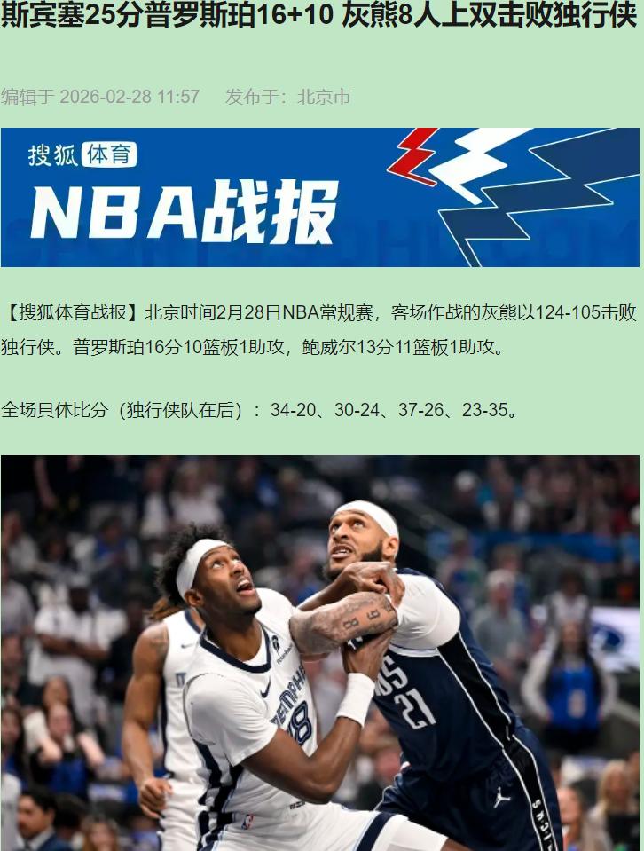你以为缺了东欧独行侠才输?错了。就算东契奇在替补席挥毛巾,这支球队的防守魂也早就丢了。 第三节那三分钟我直接关直播——不是受不了分差,是受不了五个白衣球员像木桩子一样站着看灰熊投三分。斯宾塞?这名字赛前多少人打过?今晚他拿25分如入无人之境。普罗斯珀在独行侠禁区抢板像逛自家客厅,加福德的卡位呢?鲍威尔的协防呢?镜头给到达拉斯替补席,一张张脸写着"赶紧结束"。 灰熊哪是乱拳打死老师傅,分明是"实习生把大公司系统搞崩了"。他们战术粗糙得像野球场,可就靠着拼劲——小皮彭冲起来不要命,篮板球45比38,二次进攻多拿12分。独行侠呢?空有豪华阵容的架子,骨子里是"核心依赖症"晚期。 米德尔顿10分?那是散步散出来的。威廉姆斯16分?零敲碎打改变不了潮水般的溃败。最离谱的是第三节崩成那样,教练组居然不叫暂停——是战术本丢了,还是根本没应急预案? 我看这场惨败也许是好事。纸老虎被戳破才能看见真窟窿。灰熊证明了一件事:篮球不会说谎,你漏练的防守轮转,你忽视的篮板卡位,都会在某个夜晚集体反噬。达拉斯该醒了——季后赛如果东欧倒下,这套"无头苍蝇"体系撑不过半场。至于灰熊?享受这顿饺子吧,但记住,手感会凉,拼劲不会。下回再见,希望看到的是两支有魂的球队。斯宾塞25分普罗斯珀16+10 灰熊8人上双击败独行侠