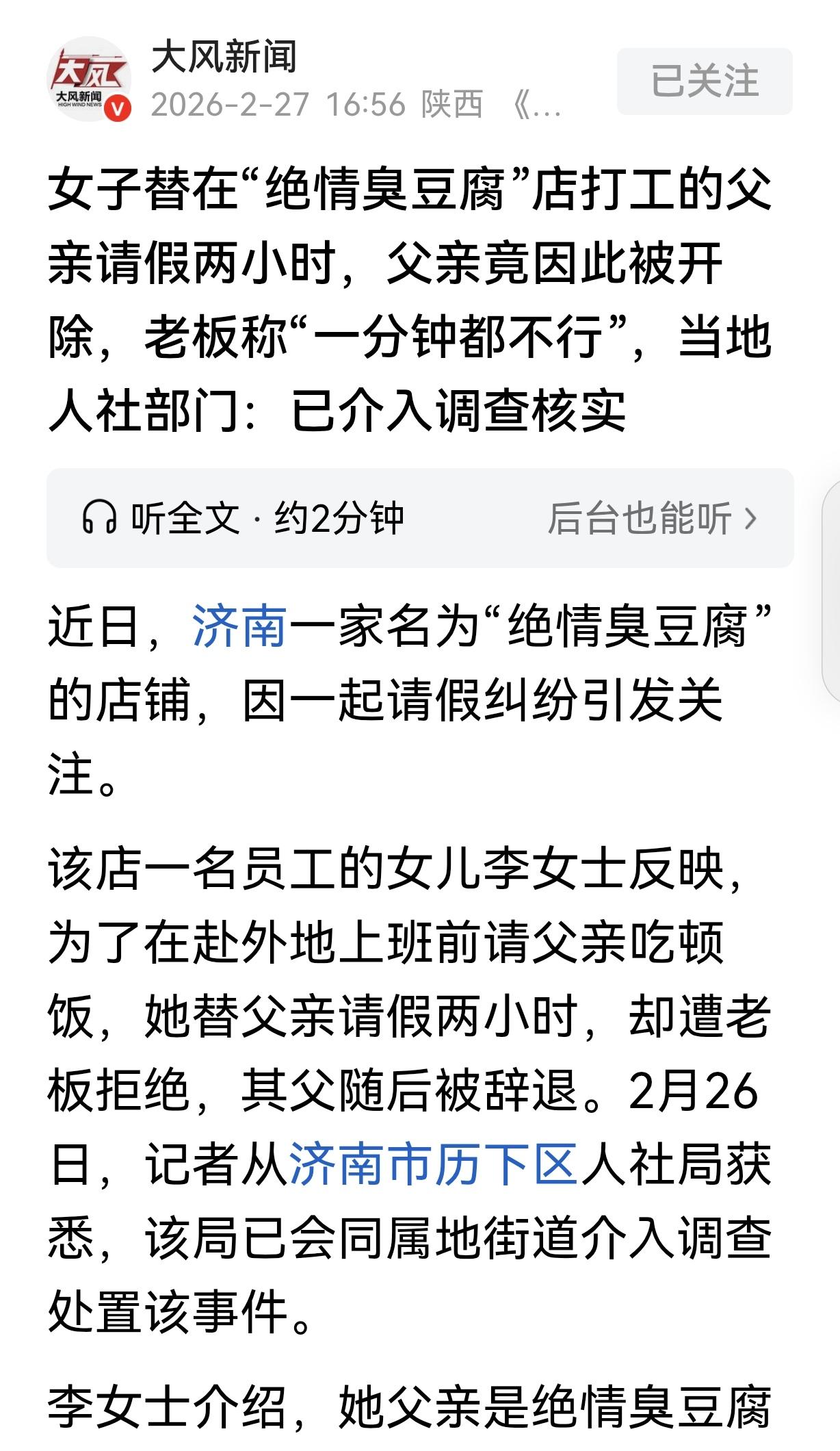 “周扒皮都甘拜下风!”山东济南,一女子大年初五要回杭州上班,想跟父亲吃顿饭,就在晚上11点,跟父亲打工的臭豆腐店老板请假2小时,说扣掉工资都可以。万万没想到,老板一口回绝,说“一分钟都不行”,随后把父亲辞退。父亲春节就休息1天,平时加班加点是常事,老板也不给加班费,这老板太尖酸刻薄。女子怒了,直接跑到店门口跟老板算账。 山东济南宽厚里有一家叫 “绝情臭豆腐” 的小店,最近因为老板的绝情操作,彻底被大家关注起来,事情的起因很简单,就是一顿想和父亲吃的团圆饭,却被老板搅黄,还把勤恳干活的老员工给辞退了,这老板的尖酸刻薄,真的连周扒皮都比不上。 事情是这样的,有个李女士,家在济南,平时在杭州上班,春节回济南探亲,初六就要回杭州。 她的父亲老李,今年54岁,在这家臭豆腐店干了快三年,一手炸臭豆腐的手艺特别好,店里高峰期的时候,他一个人能同时照看两口炸锅,一天能炸四五十筐,是店里的主力员工。 老李为人老实勤恳,平时干活从不偷懒,每天从上午10点忙到凌晨1点,天天如此,加班加点更是常事,可老板从来不给加班费,连一句辛苦都没有。 春节期间,店里生意忙,老板更是没让员工好好休息,老李整个春节就只在年三十休息了一天,其余时间天天连轴转,就算感冒发烧,也只能带着药上岗,从没敢请假。 李女士在家待了十天,父女俩就只凑出一顿年夜饭,眼看就要回杭州了,她心里特别不是滋味,就想在临走前,再和父亲吃一顿团圆饭。 李女士也考虑到店里的生意,特意选在正月初五晚上11点,这时候客流量已经低谷了,不会影响店里做生意。 她主动给臭豆腐店老板打电话,替父亲请假两个小时,还特意说明,请假的这两个小时,工资可以全部扣掉,就算有什么营业损失,也由她来承担,怎么都可以,就求老板通融一下。 可万万没想到,老板的态度特别强硬,没等李女士把话说完,就一口回绝,语气特别冲,说 “一分钟都不行”,挂了李女士的电话后,老板立马给老李打了电话,威胁老李说,敢请假就立马开除。 老李一辈子老实本分,就想安安稳稳干活赚钱,没敢反抗,可即便这样,当天晚上,老板还是直接把老李辞退了,没有提前通知,没有任何补偿,连春节期间加班的工资都没结清。 老李心里又委屈又寒心,干了快三年,没功劳也有苦劳,平时兢兢业业,随叫随到,从不偷懒,春节也没好好休息,就因为想陪女儿吃顿团圆饭,请假两个小时,还愿意扣工资,老板却连这点情面都不讲,直接把人辞退,实在太过分了。 李女士知道这件事后,气得不行,她没想到老板会这么绝情、这么尖酸刻薄,她实在咽不下这口气,第二天就跑到臭豆腐店门口,找老板算账,把事情的来龙去脉跟路过的人说清楚,控诉老板的冷血行为。 有路人把这一幕拍了下来,发到了网上,很快就引发了大家的关注,网友们都特别生气,纷纷吐槽这个老板太冷血、太抠门。 后来还有曾经在这家店干过的员工爆料,说这个老板一直都这样,尖酸刻薄到骨子里。平时员工给顾客多夹一勺泡菜,老板都要念叨半天,对员工更是动辄呵斥,完全不尊重人。 之前还有暑假工在店里干了十几天,辛辛苦苦干活,最后老板找各种理由拖欠工资,一分钱都没给。 事情发酵后,济南市历下区人社局和当地街道办很快就介入调查,经过核实,老板的做法确实违法了,按照法律规定,员工因为家庭合理的事情请假,就算用人单位不批准,也不能随便解除劳动关系,老板仅凭自己的意愿,就把老李辞退,属于违法解除劳动合同。 而且老李春节期间加班,老板没支付法定的三倍加班费,平时每天工作十几个小时,也违反了劳动法关于工作时长的规定。 老板这时候才慌了神,主动联系李女士道歉,还卖惨说自己交社保压力大,只愿意支付一个月工资作为补偿,可李女士坚决不同意和解,已经委托律师,准备通过劳动仲裁维护父亲的合法权益。 按照规定,老板违法解除劳动合同,要支付双倍的经济补偿金,老李干了三年,光这一项赔偿,就比老板提出的一个月工资多很多,再加上拖欠的加班费,老板要赔的钱可不少。 现在这家臭豆腐店,因为这件事口碑彻底崩塌,线上平台全是差评,线下也没人愿意去消费,已经被迫关门停业了。 其实老板做生意赚钱没错,但也不能这么漠视员工的合法权益,这么尖酸刻薄、不近人情,员工勤勤恳恳干活,就想得到一点尊重,一点合理的通融,可这个老板,连一顿团圆饭的时间都不肯给,最后落得店铺关门、声誉尽毁的下场,都是他自己造成的。 这件事也给所有老板提了个醒,生意要做长久,不能只想着赚钱,还要守法律、讲人情,尊重员工的付出,不然再红火的生意,也迟早会凉。 而老李这样的普通劳动者,遇到不公平的待遇,也不用忍气吞声,要学会用法律维护自己的合法权益。