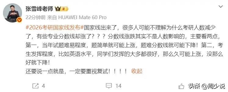 #张雪峰谈有专业分数线上涨#“精辟!”2026考研国家线刚出炉,不少考生懵了:报名人数少了45万,怎么部分专业分数线还往上走?张雪峰老师发文解读,瞬间冲上热搜。 张雪峰直言,分数线涨跌和报考人数关系不大,主要看两点:一是当年试题难度,题目偏基础,高分变多,线自然容易抬升;二是考生整体发挥,公共课、专业课发挥稳定,整体分数区间上移,分数线也会跟着调整。更重要的,还是重视“复试”! 此话一出,瞬间引发热议。有网友纷纷表示:“终于懂了,不是人少就好考,留下来的都是实力派”。 也有网友更是感慨:“以为考完初试就松口气,没想到复试才是硬仗”。 周少想说,不难发现,考研早已不是“凑人数”的竞争,而是有效实力的比拼。今年不少弃考考生属于“试水党”,坚持到最后的多是备考充分的往届生与应届生,整体应试水平不低,分数线自然不会大幅回落。 比起纠结分数线涨跌,更该把精力放在复试上。初试只是入场券,复试往往能决定最终录取结果,不少高分考生因复试准备不足遗憾落榜的例子,每年都不少见。 实际上,考研这条路,拼的不只是一时分数,更是全程的规划与定力。别被人数、分数线的表面变化带偏,踏实打磨专业能力、认真准备复试,才是最稳妥的选择。 张雪峰说的很透彻明白,对后续备考的同学来说,也该明白:理性选择、扎实积累,远比盲目跟风更重要,这才是升学路上最该守住的初心。#周少说教育# #寻美三湘#