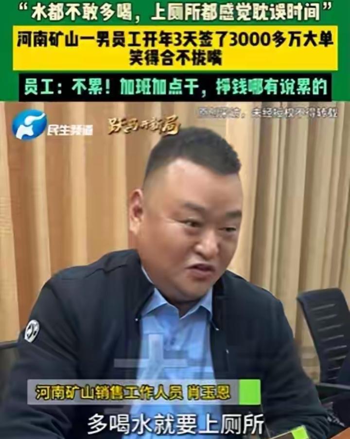 近日河南长垣矿山开工直接爆火,一位男员工开工才3天就签下了3000多万的大单,对着镜头笑得合不拢嘴,看着都替他开心。 他说为了不耽误签单,连水都不敢多喝,就怕上厕所错过客户。同事也说,加班加点干也不累,挣钱哪有说累的!这股拼劲真的太接地气了。 全网都在接好运,希望大家今年都能生意红火、赚钱赚到手软!