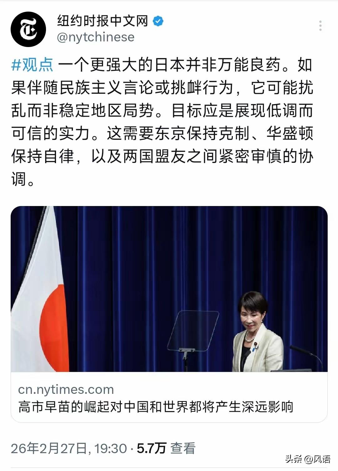 军国主义抬头,美媒率先反思。 《纽约时报》认为,美国需要一个低调的日本,但这个日本需要实力,而且这个实力必须是可信的。 显然,美国并不反对日本壮大自身实力,但要有度,表现形式一要“低调”,二是要具威胁力,即“可信”,显然,日本违反了这一规则,它在“实力”不“可信”情况下选择了“高调”。这么一来,将成为美国的负担。 《纽约时报》隐讳的认为,当下日本军国主义抬头放弃“克制”,源于华盛顿的不“自律”,给人的感觉是,日本军国主义抬头,背后是美国的“紧密”的配合。这么一来,美国就成了军国主义复活的元凶。 从《纽纽时报》的报道来看,现在日本的发展已脱离了美国的初衷,它需要的是个可控而有实力的日本,然而,一个有实力的日本不止是脱离美国控制,还可能将美国拉下水。