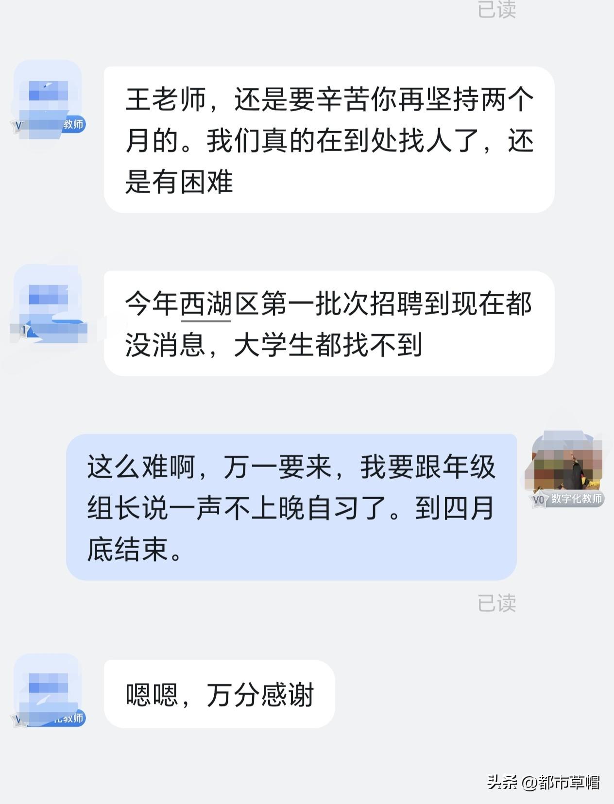 马上要开学了,真的不想再去上课了,但是学校似乎确实有困难。不仅我们学校是这样,城区的保俶塔实验学校也一样,快开学了还在招代课老师。 学校领导说,我们西湖区第一次招聘到现在都没有消息,找大学生代课都找不到。我们学校现在的情况是,一方面我们已经超编了,但是有些学科还缺人,因为有人还在休产假,语文也需要代课老师。原来第一次招聘在上年度秋季就开始了,没有考上的一些大四学生常常会找个临时工作干干,所以代课老师不难找。 今年因为第一次招聘还没有开始,孩子们都在准备考编,不愿意顾此失彼,都不愿来学校代课。尤其是我们学校目前没有编制,大学生们更不愿意来学校代课。 有些地方老师已经过剩分流了,有些地方考虑到人口增长的实际情况,在招聘新老师方面编制抠得很紧,主要是着眼于后续的发展,到时候老师多出来了再分流可不是一件容易的事。 我来杭州这么些年,绝大多数领导对我还是不错的,现在年纪大了,确实不想再去代课,但是我还是答应了学校领导代课两个月。等休产假的老师假期结束,我就可以放下了。晚自习是我最头疼了事,我已经提出不上晚自习了,虽然我上晚自习的两个晚上,孩子的作业质量会好一些,但是我这个年纪,吃不消从早上六点多熬到晚上八点多。