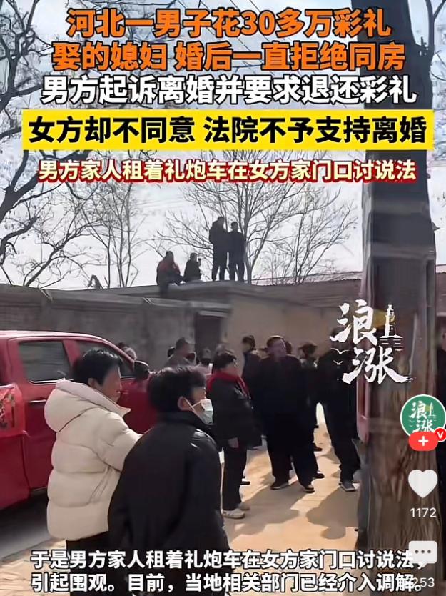 河北邢台,一男子花了30多万彩礼娶的媳妇,因婚后媳妇拒绝同房,穿着衣服睡觉引发男方不满,男方随即提出了离婚,并要求女方退还彩礼以及五金,然而,女方却表示双方有感情不愿意离婚,最终法院判决两人不准离婚,男方无语,随后租来了礼炮车来到女方家门口讨说法。 河北邢台高某的遭遇,在网上引起了不小的讨论,说起来也让人唏嘘。   2月22日下午,高某的家人租了一辆礼炮车,直接开到了女方李某家门口讨说法,礼炮声轰了四天,场面闹得不小,到底发生了什么事,能让一家人闹到这种地步。   事情还要从2024年2月说起,高某和李某登记结婚,还办了婚礼,为了把这个媳妇娶进门,高某前前后后花了超过30万块钱。   这30多万可不是小数目,其中彩礼就有25.8万,还有5.22万的五金首饰和手机,高某也拿出了相关的购买记录,还有自己父母的转账记录,证明这些钱确实花在了娶媳妇上。   本以为花了这么多钱,能安安稳稳过日子,可让高某没想到的是,婚后十个月,他连李某的手都没碰过。   在结婚之后,李某一直不让高某动自己的身子,平时睡觉都不在一个屋子,李某还经常回娘家好长时间,两人没有一点夫妻的样子。   高某心里越来越不是滋味,自己花了毕生积蓄,娶回来的媳妇,既不同房,也不跟自己好好过日子。   最后实在没办法,他就一纸诉状把李某告上了法院,要求离婚,还要求李某退还当初给的彩礼和五金。   可法院的判决,让高某彻底懵了,法院驳回了他的离婚请求。   法院驳回的原因是,李某表示自己坚决不同意离婚,还说她和高某的感情没有破裂,高某也拿不出来两人关系破裂的实在证据。   同时,李某又控诉高某,说高某天天想和她同房,就算是她生理期也不例外,有时候高某喝了酒,还会强行要求同房。   李某还说,因为自己拒绝同房,高某就对她又打又骂,还拖拽她、非法拘禁她,不让她出门,甚至不让她上厕所,长期下来,她患上了重度抑郁症。   更让人疑惑的是,李某在说起彩礼的时候,说法前后矛盾,漏洞百出。   一开始,她否认高某说的给了25.78万彩礼,说自己根本没收到这么多钱,还说当地的彩礼风俗就是18.8万,甚至否认高某给过彩礼这件事。   可到了后面,她又随口说了一句,自己买东西、看病,已经把高某所说的那些彩礼都花光了。   这就让人看不懂了,要是没收到彩礼,又怎么会把彩礼花光呢?明眼人都能看出来,这里面肯定有问题。   网友们看到这件事,也都炸开了锅,大部分人都猜测,李某之所以不同意离婚,根本不是因为感情没破裂,而是不想退还彩礼。   大家都清楚,按照相关规定,两个人结婚时间越长,离婚时返还的彩礼就越少,要是拖满一年,说不定就不用退彩礼,或者只退一小部分。   当时李某和高某已经结婚十个月了,再拖两个月就满一年,到时候就算真的离婚,她需要退还的彩礼也会少很多,这大概就是她一直拖着不离婚的真正原因。   还有网友觉得,高某也挺委屈的,他想证明两人感情破裂,可女方拒绝同房这种事,平时很难留下证据,总不能天天拍女方睡觉的视频吧,这也不符合常理。   高某和李某结婚才十个月,既没有分居满两年,也没有其他法定的离婚情形,他提交的证据,不足以证明两人感情已经破裂,所以法院才没有支持他的离婚请求。   说来说去,这件事的核心,还是围绕着彩礼和婚姻的本质。   婚姻本来是两个人因为感情走到一起,相互陪伴、相互扶持,可有些人为了钱,不惜借着结婚的名义,骗取高额彩礼,故意拖着不离婚,这种行为不仅伤害了别人,最后也可能触犯法律。   希望这件事能有一个合理的解决办法,也希望更多人能明白,彩礼是心意,不是敛财的手段,婚姻更不能拿来做交易。