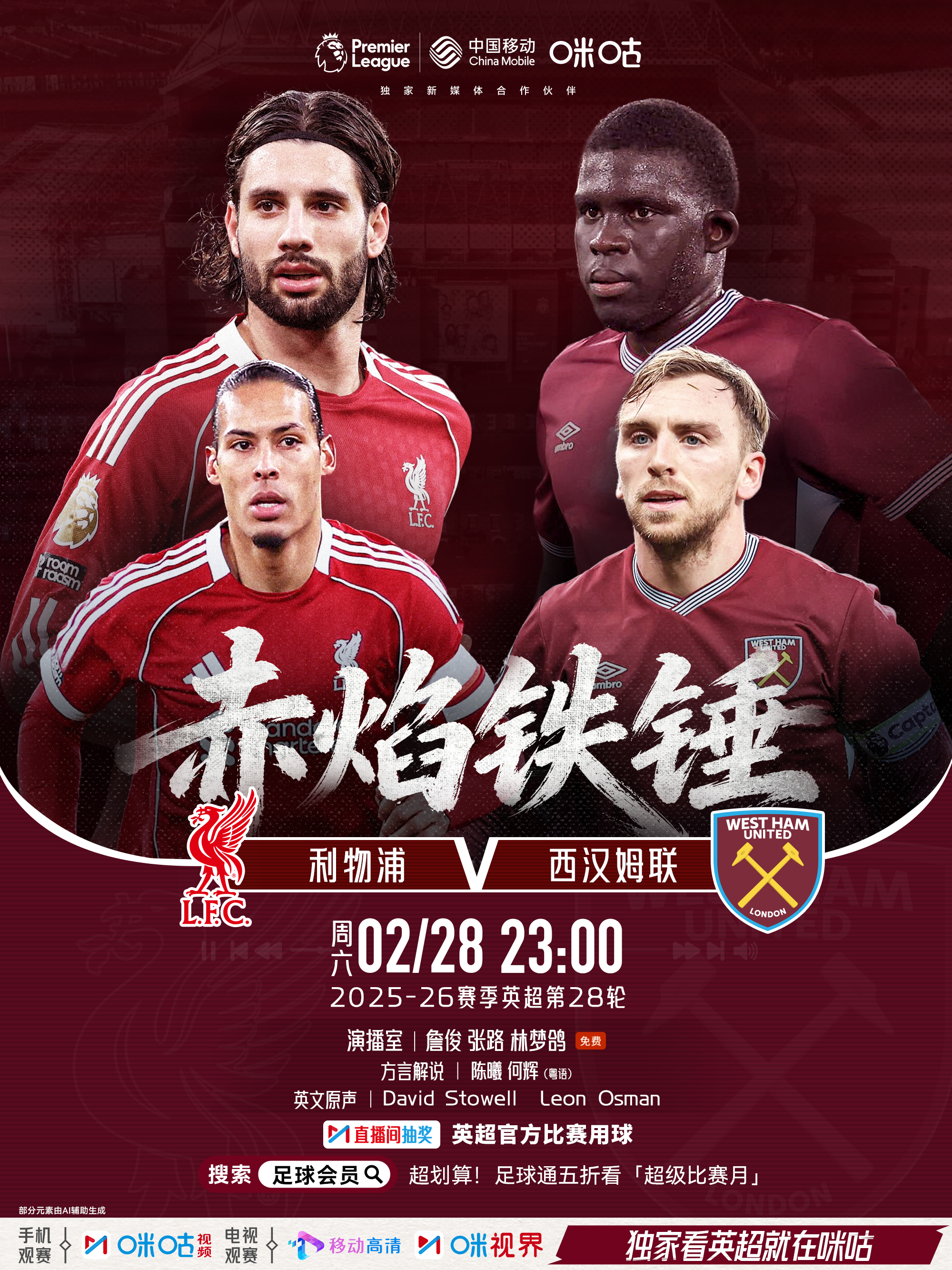 🦁 𝗣𝗿𝗲𝗺𝗶𝗲𝗿 𝗟𝗲𝗮𝗴𝘂𝗲🐦🔥 利物浦 𝙫𝙨 西汉姆联 🔨📺 《赤焰铁锤》🔒 2月28日 23:00 周六#独家看英超就在咪咕#📲网页链接