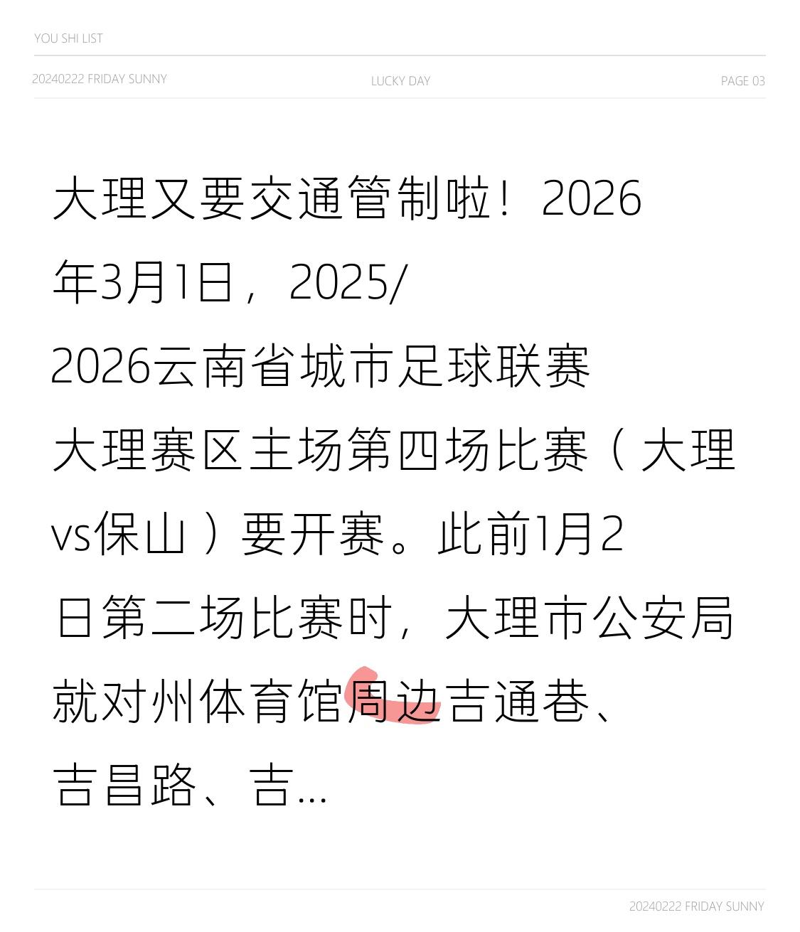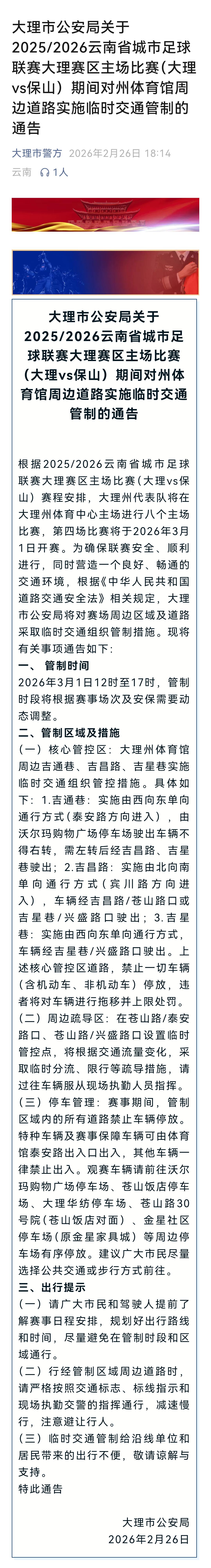 🈲❌大理又要交通管制啦! ⚽️⚽️2026年3月1日,2025/2026云南省城市足球联赛大理赛区主场第四场比赛(大理vs保山)要开赛。此前1月2日第二场比赛时,大理市公安局就对州体育馆周边吉通巷、吉昌路、吉星巷实施临时交通管制,像吉通巷由西向东单向通行,吉昌路由北向南单向通行等。 🥅⚽️玉溪在2月7日玉溪队对阵大理队比赛时,也对玉溪体育场周边部分道路管制,管制路段禁行禁停,还提醒球迷绿色出行。看来为保障赛事交通顺畅,各地都下足了功夫,大家到时候可得留意管制信息,别耽误行程。 交通管制