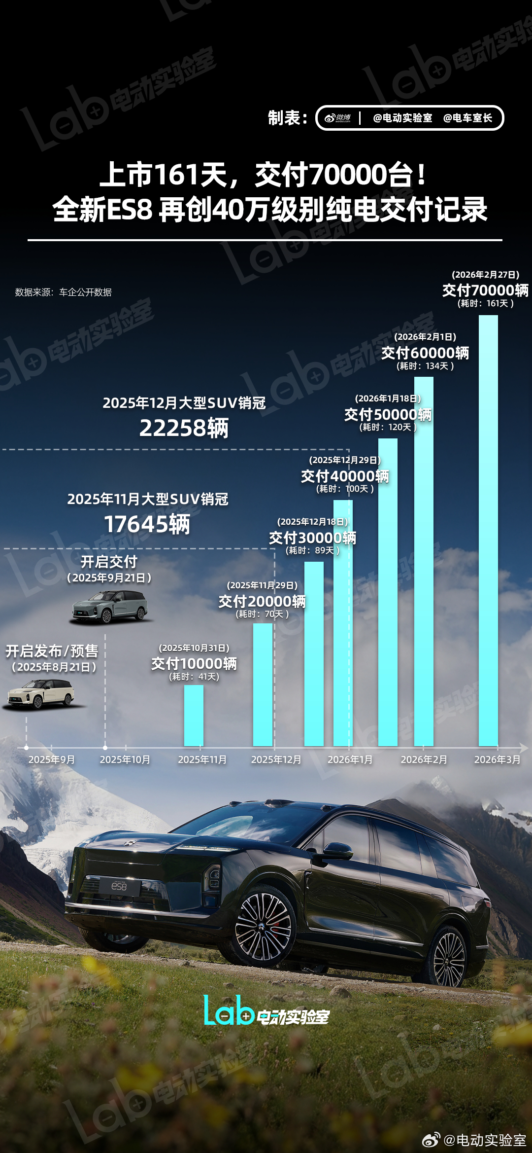 【蔚来全新ES8交付70000台】上市仅仅161天,蔚来全新ES8在昨日交付正式达70000台大关!