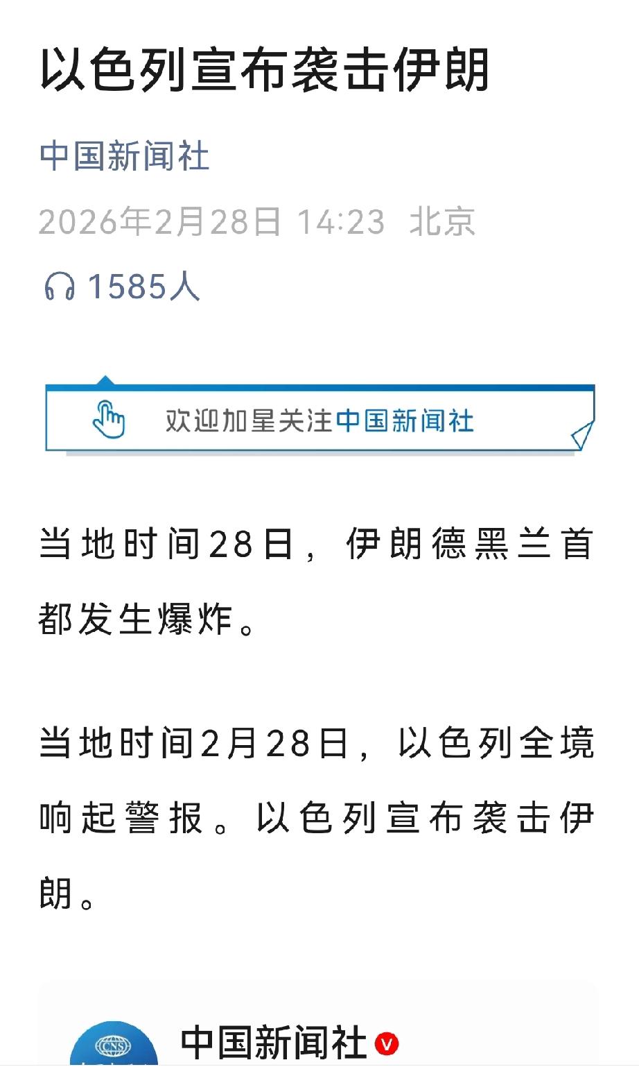 2月28日,以色列宣布袭击伊朗 当地时间2月28日,伊朗首都德黑兰爆发爆炸事件。 与此同时,以色列关闭领空,全境拉响警报。 据以色列媒体报道,此次行动为美以联合发动。 另有消息称,伊朗总统府附近也出现爆炸情况,但伊朗方面并未对此进行相关报道。