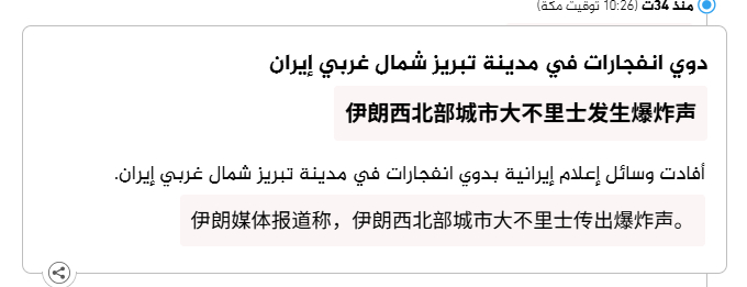 🔻伊朗媒体报道称,伊朗西北部城市大不里士传出爆炸声。以色列宣布袭击伊朗伊朗首都发生爆炸海外新鲜事热点现场