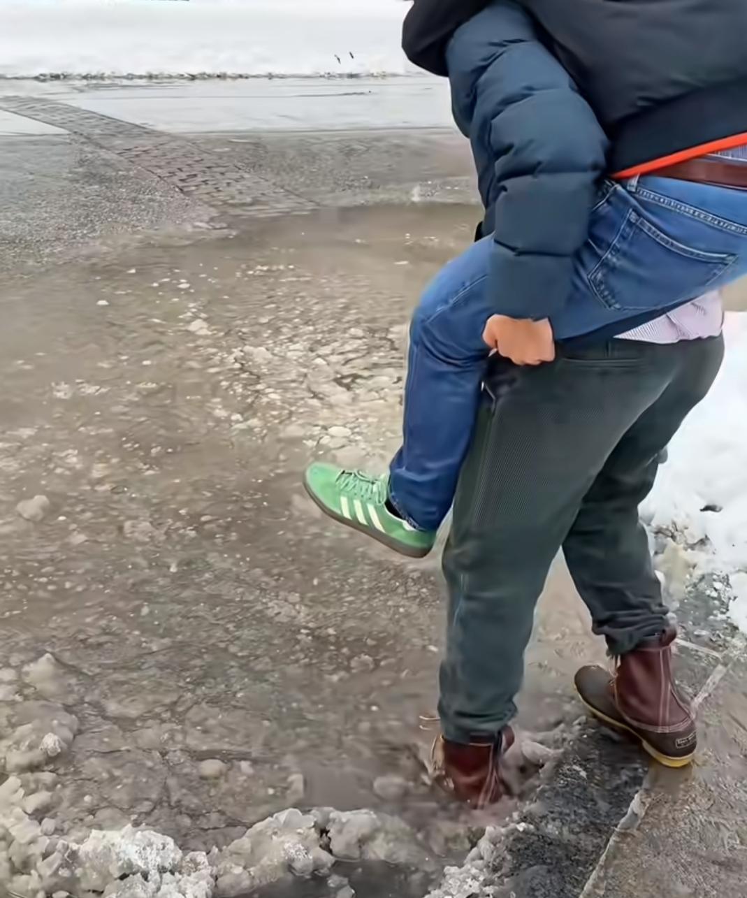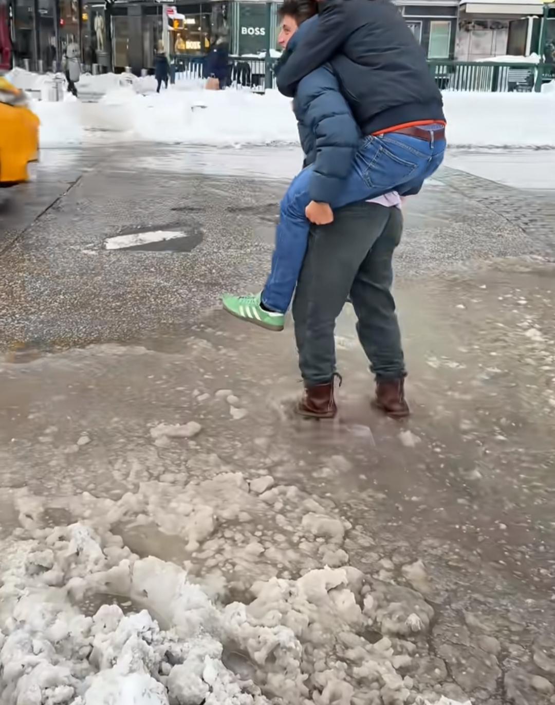不敢相信,这是纽约街头。 一些积雪还没来得及清理,气温上来了,雪开始化了。 虽然谈不上道路泥泞,但是总会把鞋弄湿。 这些老外也挺能将就,不管三七二十一,踩着水就过了。 也有一些刚穿上新鞋的,哪里愿意踩水,找到愿意背着他的朋友,也是个不错的选择。 纽约总能带给你惊喜。