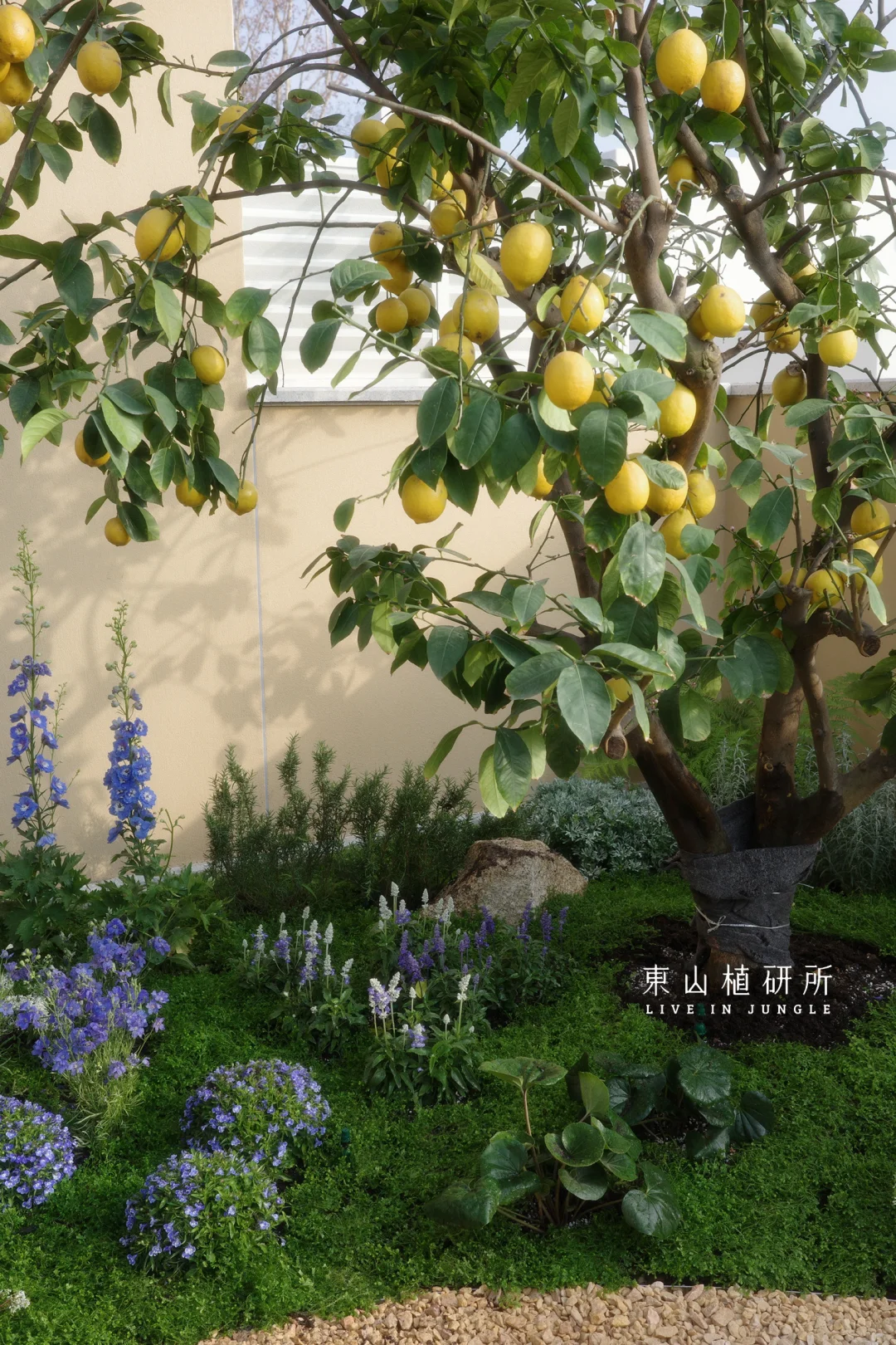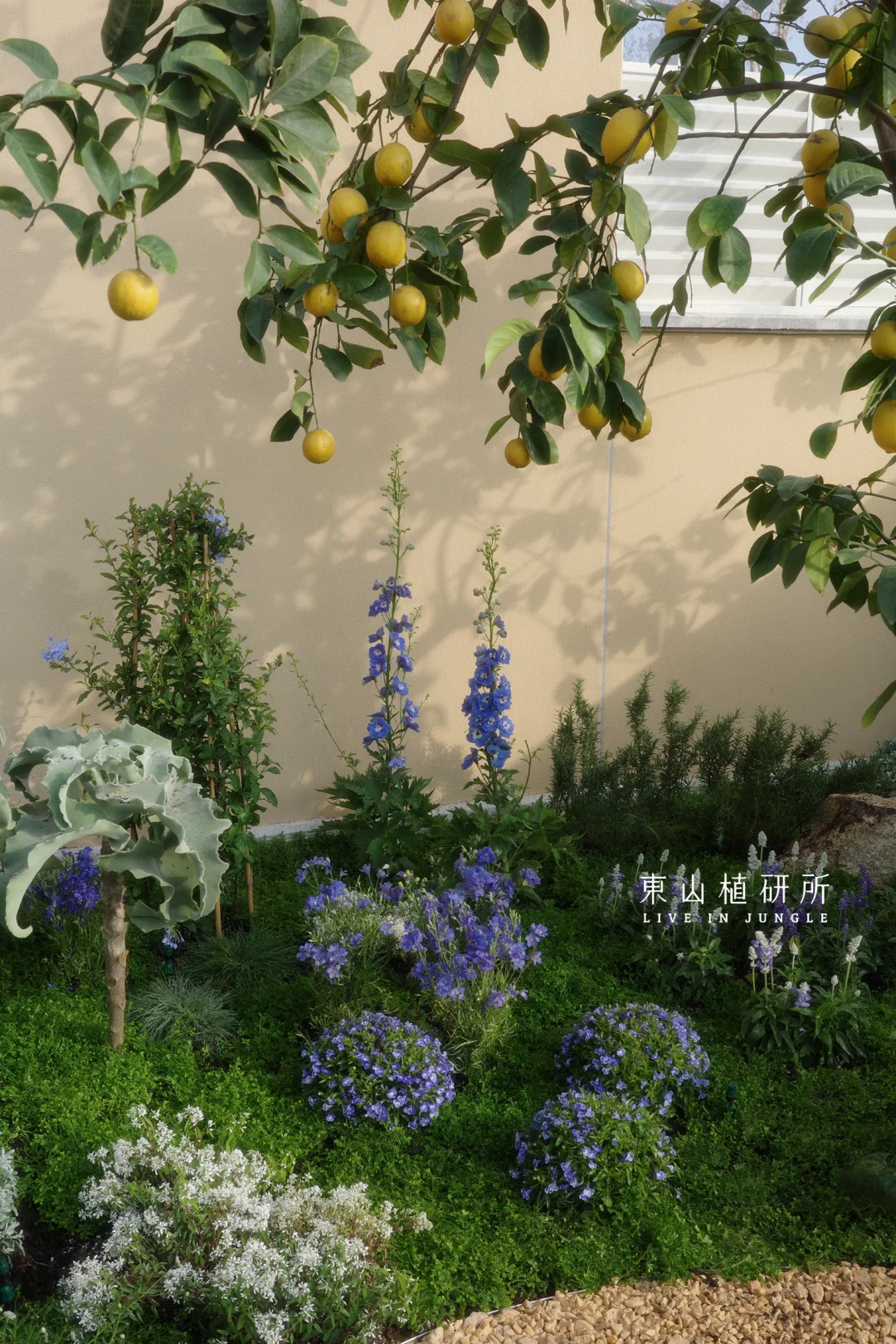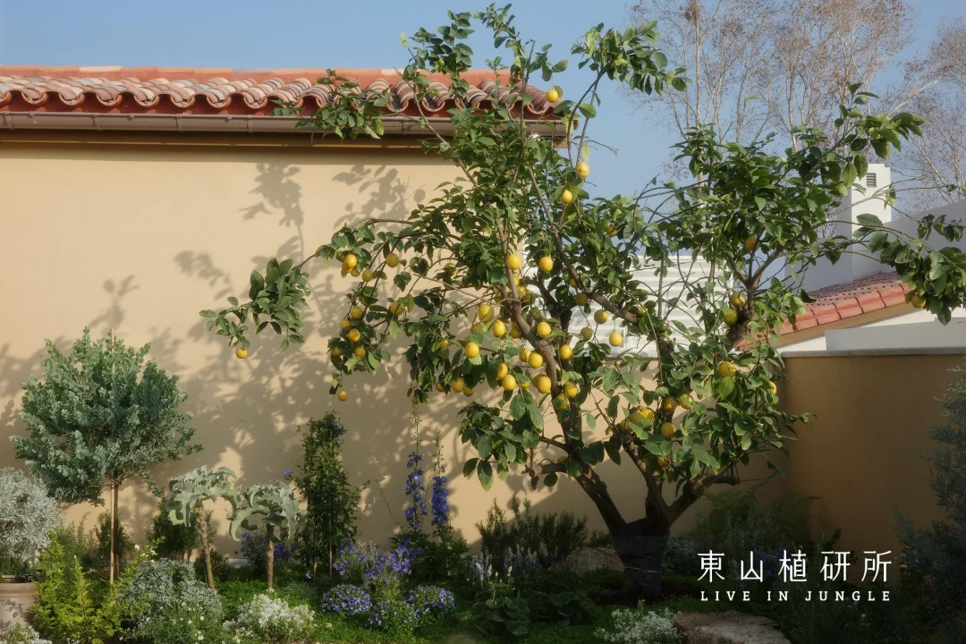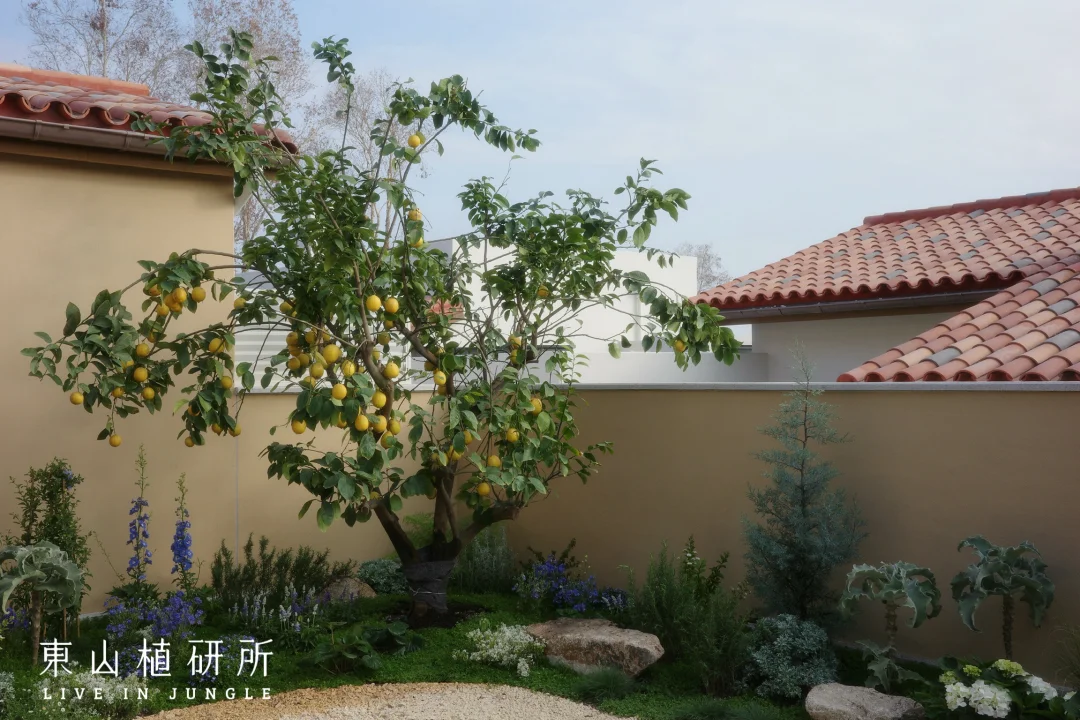 柠檬树是庭院的灵魂,春生叶、夏挂果,四季都是鲜活的自然雕塑,吸引着小鸟歇脚,蝴蝶穿梭。蓝紫色飞燕草、白色绣球等植物,灌木草本交织成境。高低错落间,是自然野趣的呼吸感,没有刻意的规整,只有原生态的鲜活。
