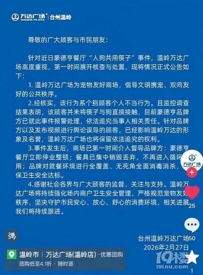 台州一自助餐厅内顾客用吃饭的筷子喂宠物狗 “这场景太让人膈应了”,台州一牛排自助餐厅内,顾客用吃饭的筷子喂宠物狗;市监所:正调查2月26日,有网友发布视频称,在浙江台州温岭市万达广场3楼的一牛排餐厅吃饭时,看到不适的一幕,顾客带着宠物狗,宠物狗蹲在凳子上,顾客直接用她使用的筷子给宠物狗喂食。视频里,一家三人一起就餐,餐桌上有很多食物及饮料,其中一个盘子里放的疑似甜点,女顾客用筷子夹起来,夹掉了,再次夹起来,喂给宠物狗。