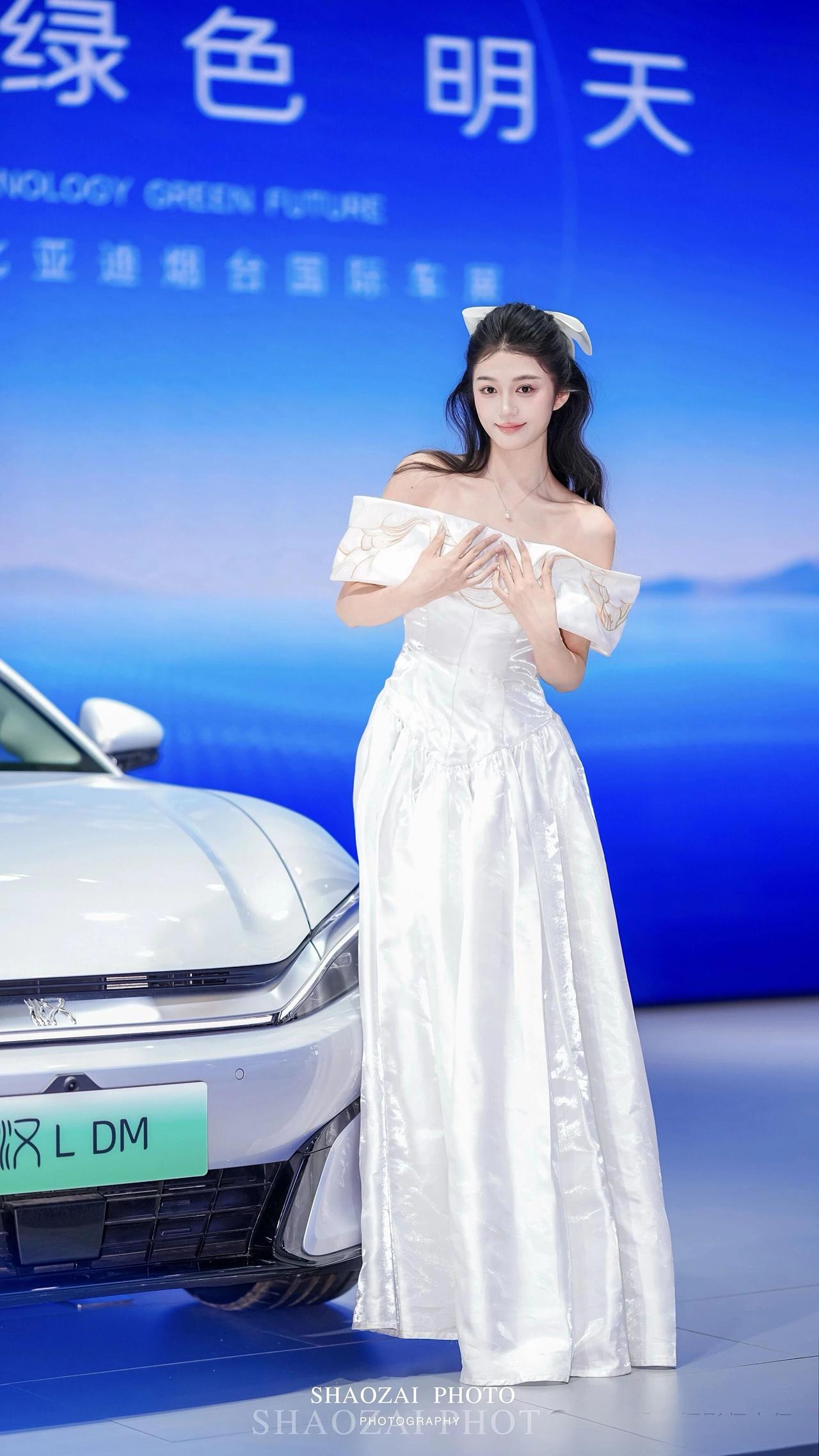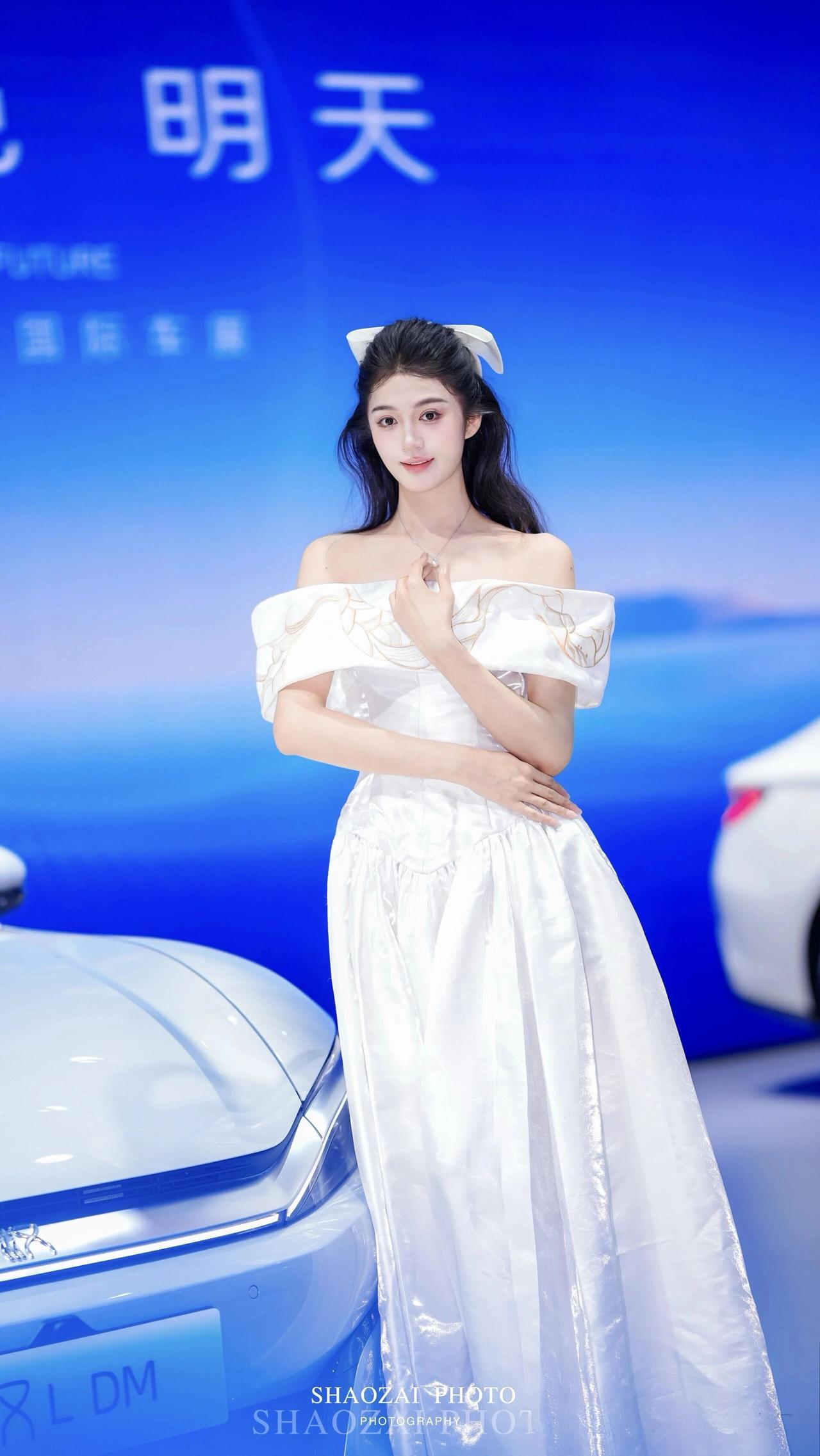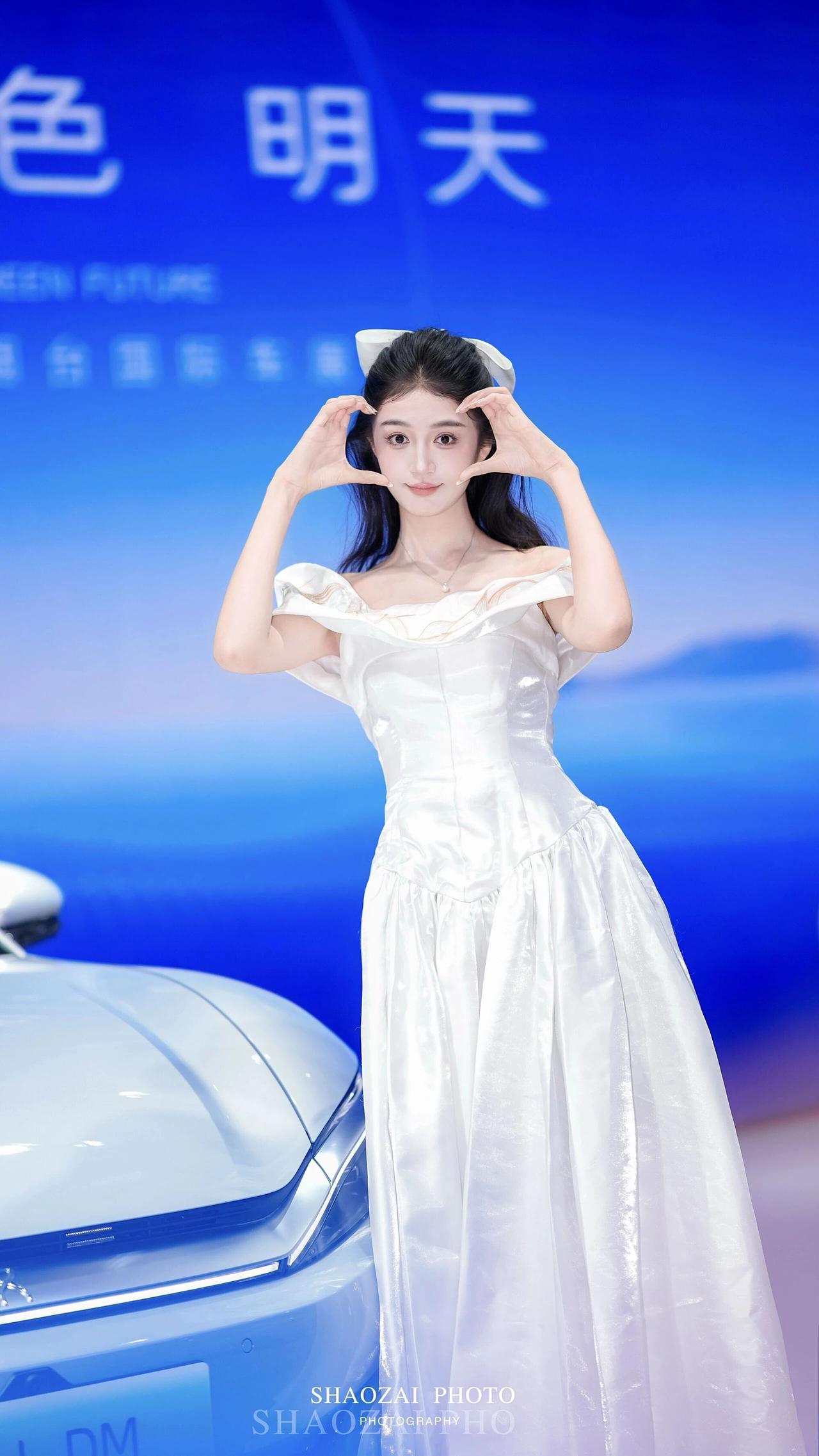 这组照片捕捉了车展上一位气质出众的模特,她身着一袭白色露肩长裙,裙身带有精致的金色刺绣纹样,搭配头顶的白色蝴蝶结,整体造型清新又不失优雅。 服饰细节:露肩设计勾勒出优美的肩颈线条,收腰版型凸显曼妙身姿,大裙摆随着动作轻扬,在灯光下泛着柔和的光泽。 场景氛围:背景是“绿色明天”的蓝色科技感展台,身旁是比亚迪汉L DM车型,冷调的展台与暖调的人物形成鲜明对比,既突出了车的未来感,也衬托出她的灵动。 姿态与表情:她时而轻扶车身,时而比心、眨眼,表情灵动甜美,每一个动作都自然舒展,在镜头前展现出自信又温柔的魅力,仿佛车展上一道亮眼的风景。