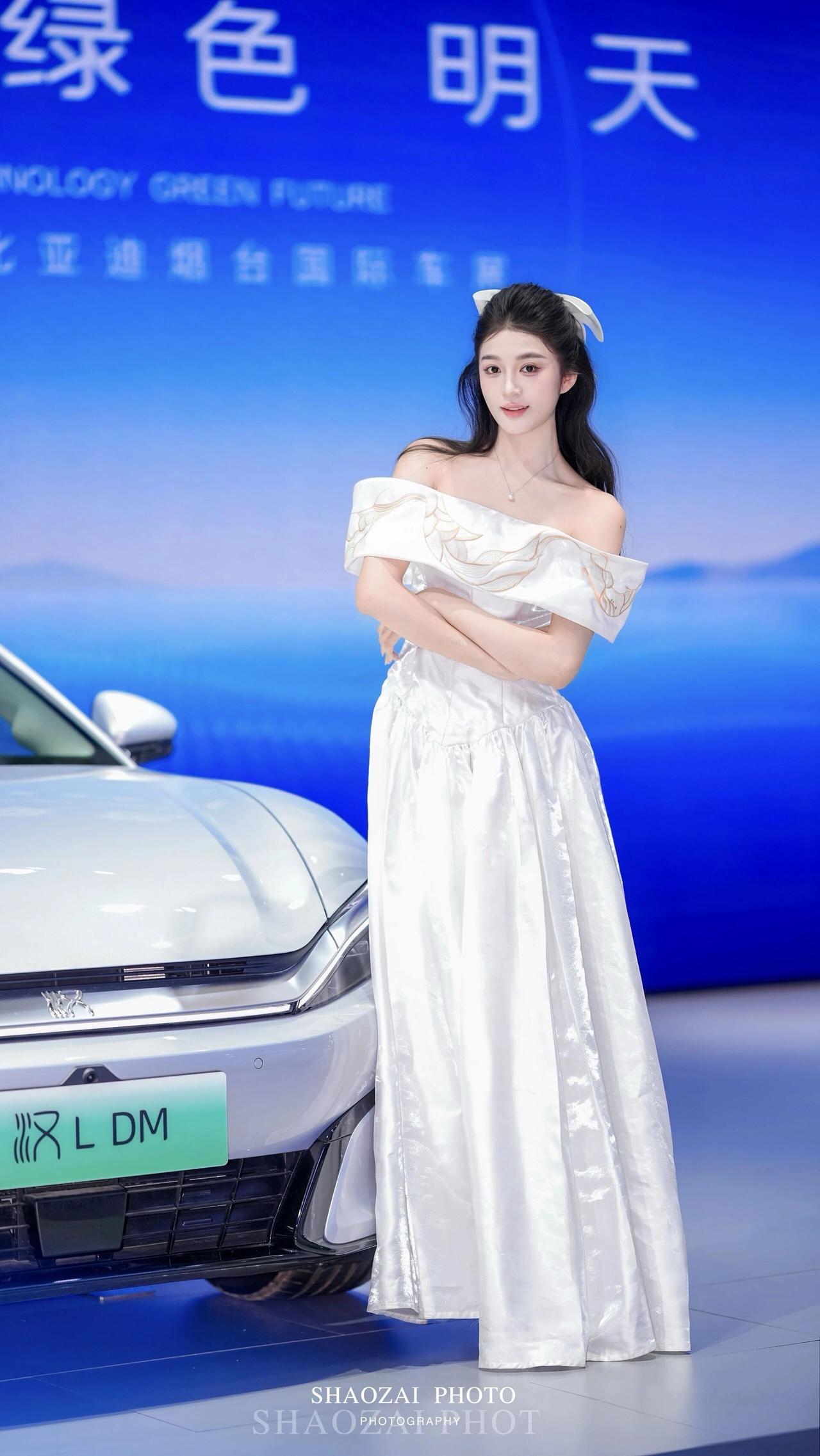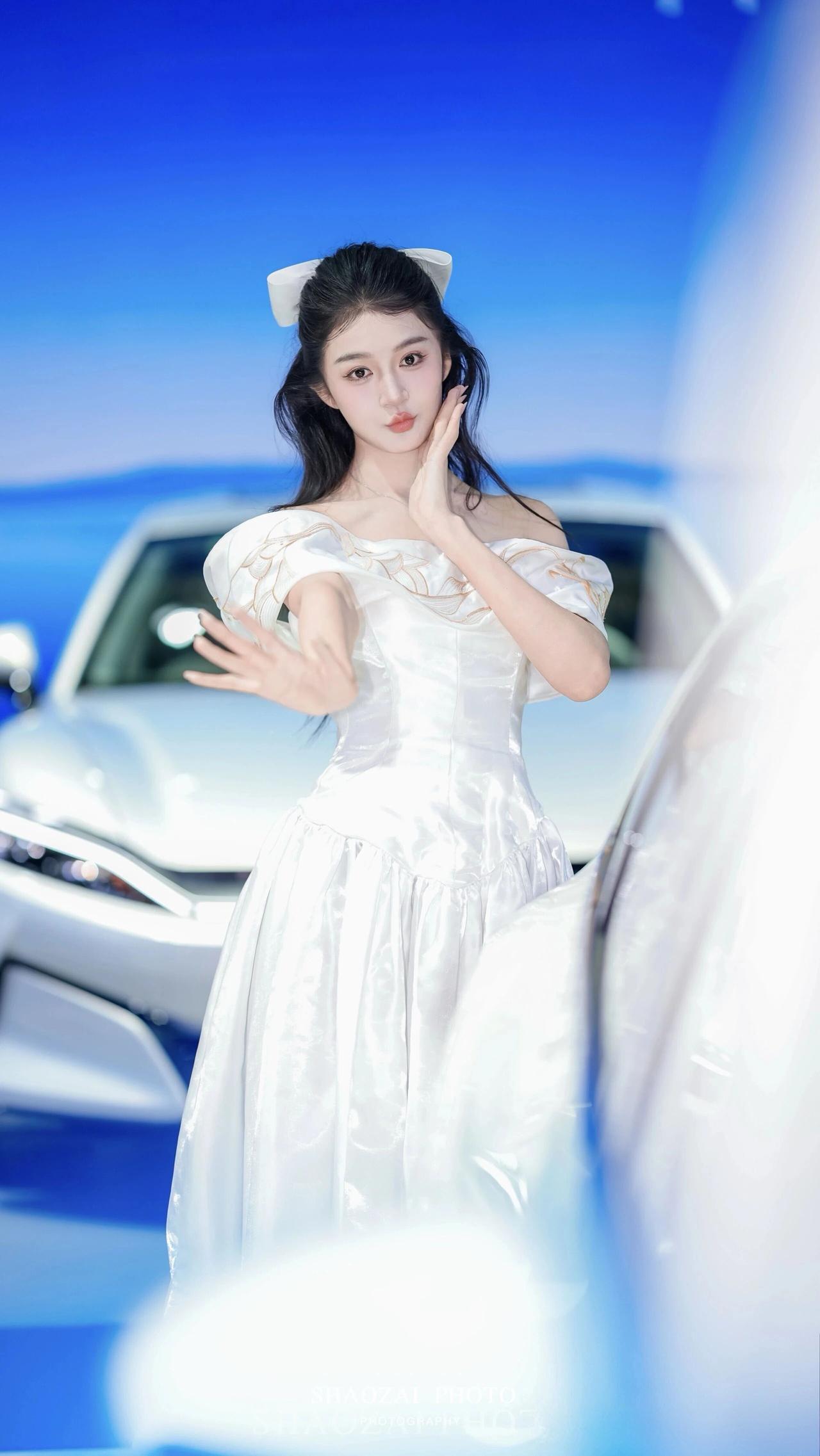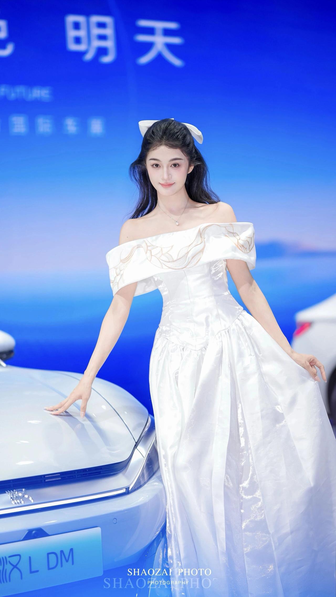 这组照片捕捉了车展上一位气质出众的模特,她身着一袭白色露肩长裙,裙身带有精致的金色刺绣纹样,搭配头顶的白色蝴蝶结,整体造型清新又不失优雅。 服饰细节:露肩设计勾勒出优美的肩颈线条,收腰版型凸显曼妙身姿,大裙摆随着动作轻扬,在灯光下泛着柔和的光泽。 场景氛围:背景是“绿色明天”的蓝色科技感展台,身旁是比亚迪汉L DM车型,冷调的展台与暖调的人物形成鲜明对比,既突出了车的未来感,也衬托出她的灵动。 姿态与表情:她时而轻扶车身,时而比心、眨眼,表情灵动甜美,每一个动作都自然舒展,在镜头前展现出自信又温柔的魅力,仿佛车展上一道亮眼的风景。