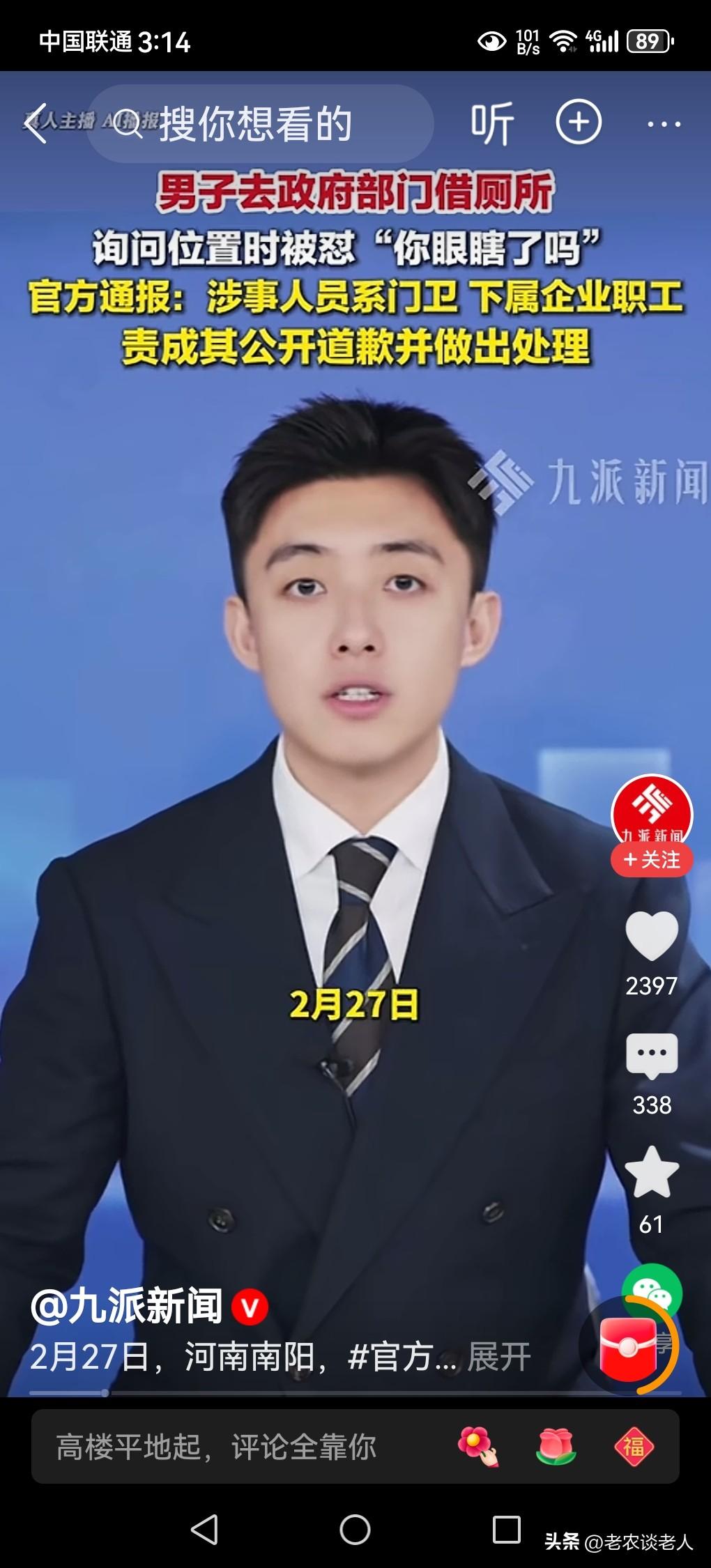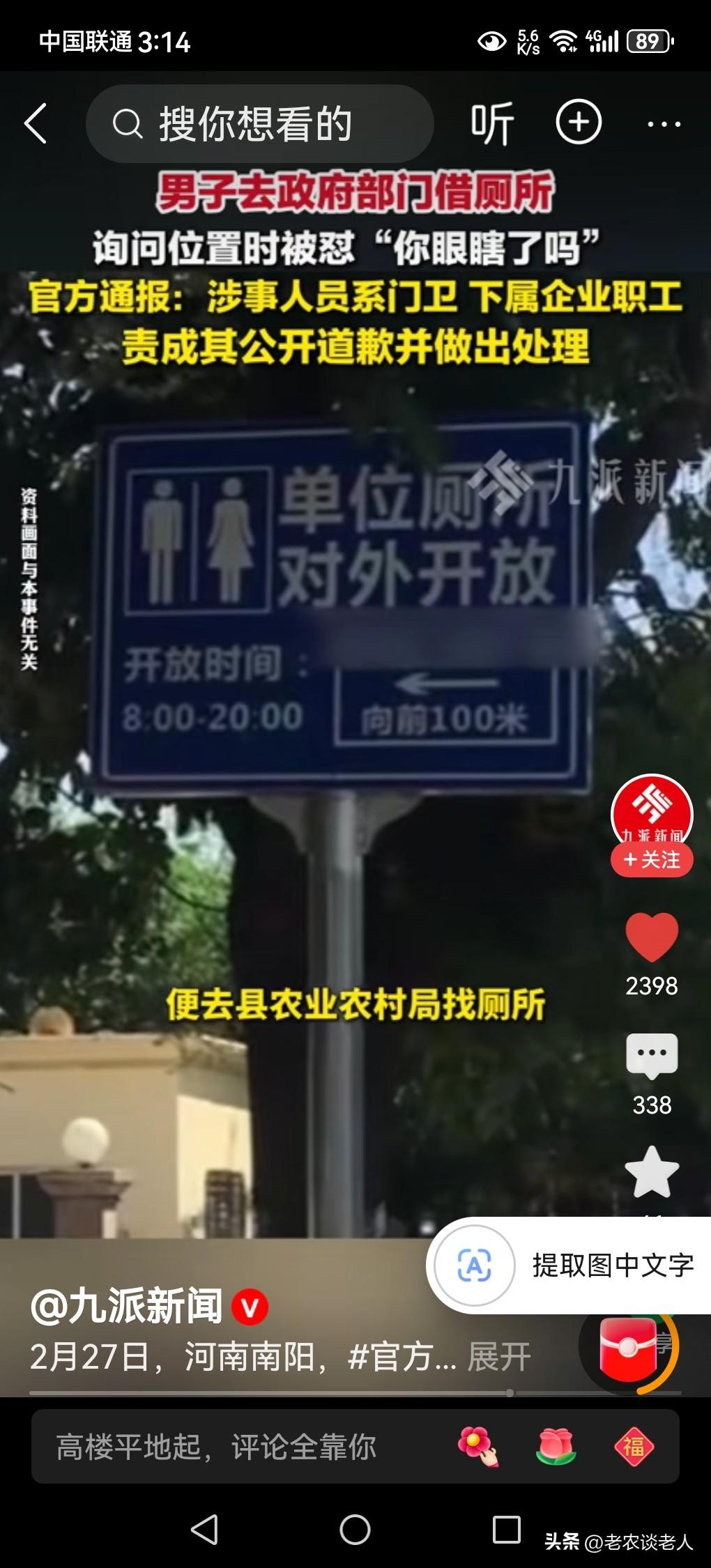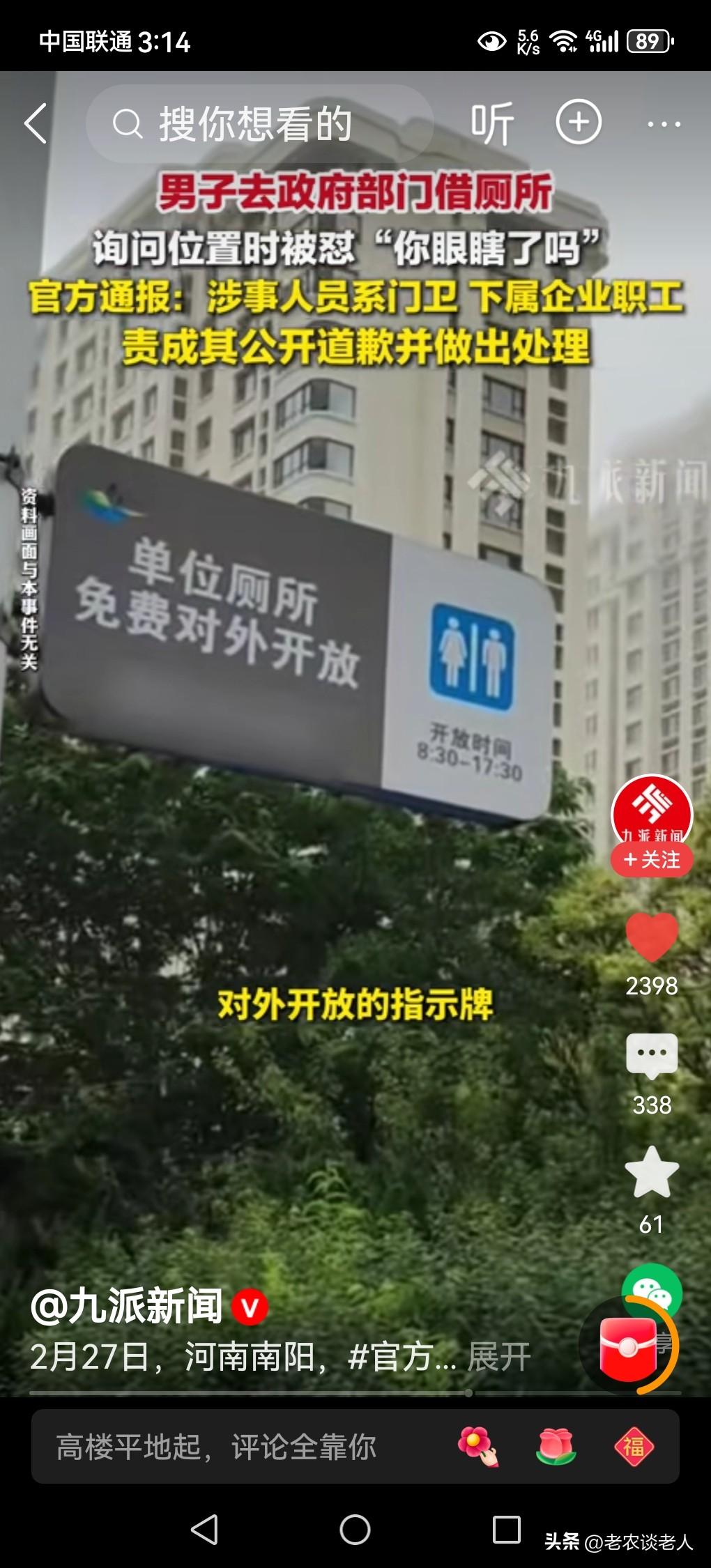 你有过去单位上公厕被挨骂的经历吗?有媒体评价,单位公厕开放不是竖牌子就完了!重点是在落实和管理上! 本人确实有多次亲身经历,明知某单位公共厕所是对外开放,有牌子为证。当我去询问的时候,且被单位的管理人员迎头痛骂,并不是一次两次,而是多次被人赶了出来。所以,后来无论怎么内急,都不敢到人家单位去借用公共厕所了。 据媒体2月28日报道,河南某县某单位厕所挂牌向外开放,有一位先生路过此地,因身体内急,需要找厕所方便的时候,但进了这家单位开放的公共厕所,先去询问单位门卫的时候,被门卫痛骂以后被报警,此事才得到了圆满的解决。目前该单位对骂人门卫,已经作出了正确的处理。 本人认为,机关单位公共厕所向外公开,是一种暖政亲民的方法,深受百姓的欢迎。而有些单位,标明向外开放的公共厕所,只挂了一个牌子,但通常是禁止百姓到公共厕所的,这种说一套做一套的,欺骗百姓的方法,屡见不鲜,到了应该改一改的时候了。 单位公共厕所已经挂牌向外开放,就必须要落实向外开放,不得说一套,做一套。当百姓上厕所的时候,而严令禁止,这种行为是不对的,是对百姓开玩笑的,是绝对不能容允的,希望相关部门应该对这样的单位必须进行整顿,让对外开放的厕所应该彻底落实,以方便百姓为目的。 以上是本人观点,如有不妥,请大家在留言区中留下你宝贵的意见。