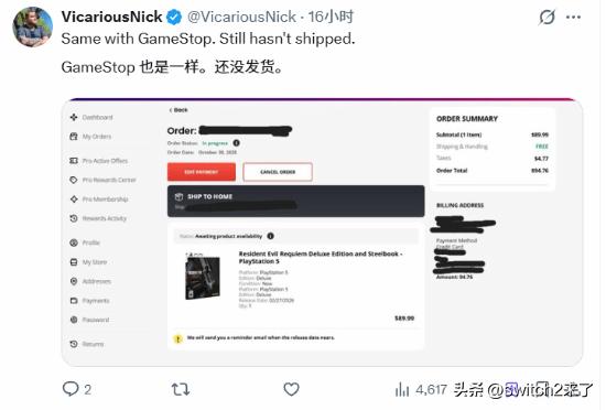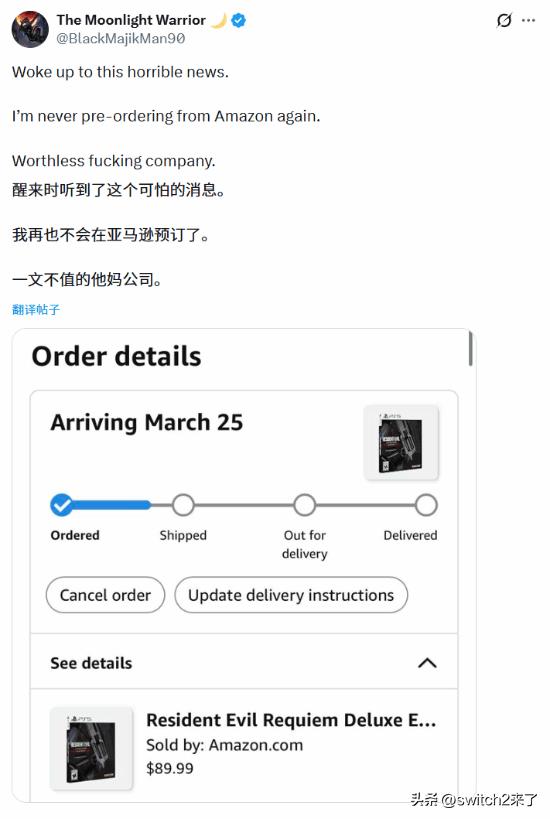 《生化危机9:安魂曲》是《生化危机》系列的最新作,由卡普空制作并发行,2月27日正式发售,登陆PC/PS5/Switch2/XSX平台。 据IGN报道,这款备受玩家期待的作品不仅收获了M站开分媒体均分89分的高评价,其销量势头也相当喜人,游戏实体版在美国的线上平台正变得越来越难以入手。截至发稿时,几乎所有平台、所有渠道都已解禁售罄。 据介绍,《生化危机9:安魂曲》的豪华铁盒版目前已在所有线上渠道全部售罄。亚马逊、百思买、GameStop和沃尔玛目前均已售空Xbox标准版实体盘;PS5版方面,只有沃尔玛仍在销售标准版。 而在Switch 2平台上,亚马逊是目前唯一还能买到实体版的线上零售商,不过售价高达76.84美元,这比官方建议零售价69.99美元贵了将近7美元。 据多家社交媒体反馈,本作的实体版目前正面临极其严重的缺货危机,愤怒的玩家们纷纷晒出订单截图表达强烈不满。 在《生化危机9》发售前夕,大量在亚马逊(Amazon)、GameStop等主流零售商预订了实体版游戏的玩家发现,自己的订单状态突然发生了变化。许多订单显示游戏到货日期被推迟到了一个月之后,更有甚者,部分玩家的订单页面直接显示“无预计到货日期”。