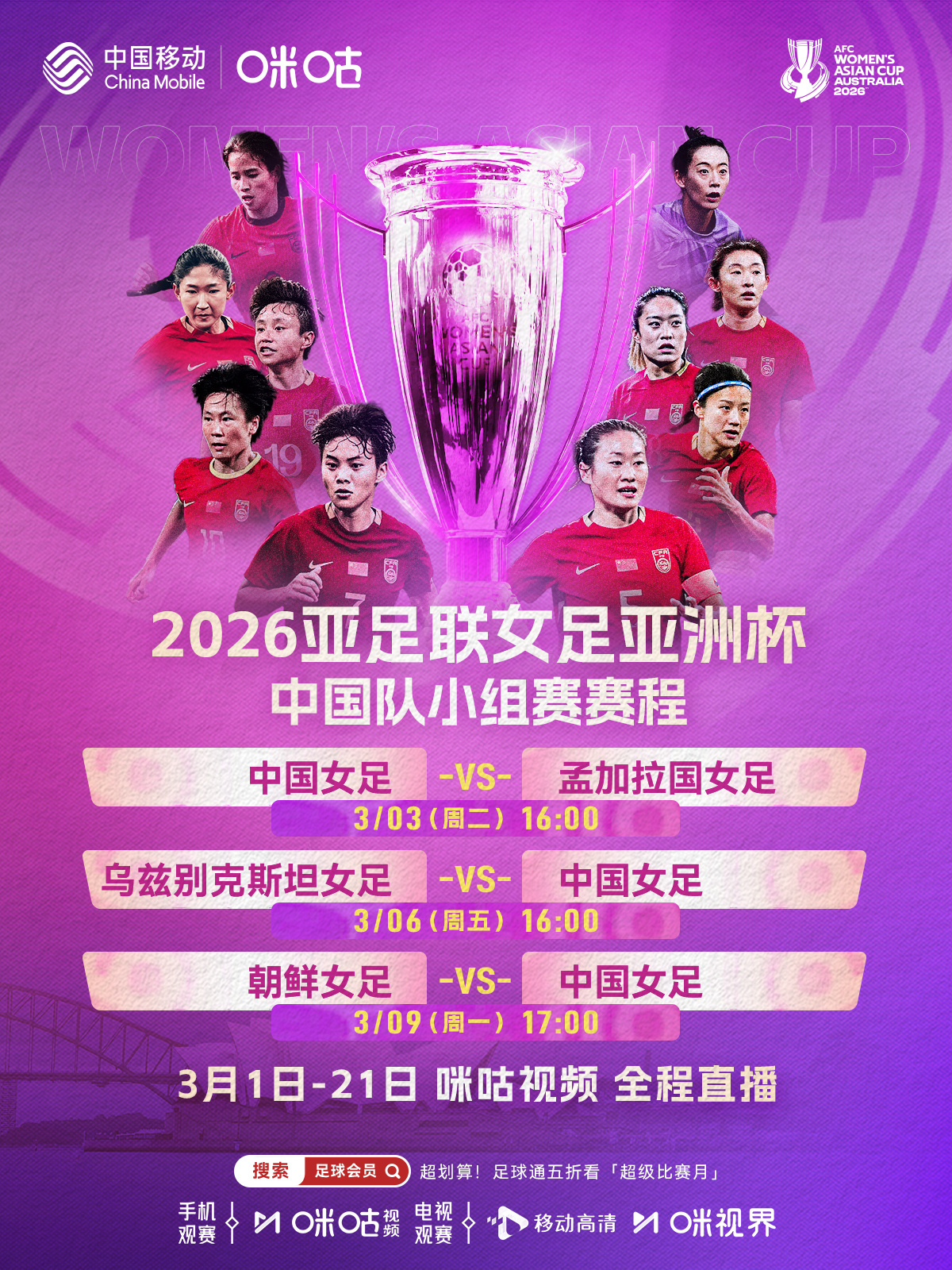 🌹 中国女足亚洲杯小组赛赛程⚔️ 首秀迎战孟加拉国女足⚽️ 为女足姑娘们加油👀 #上咪咕看女足亚洲杯# 网页链接