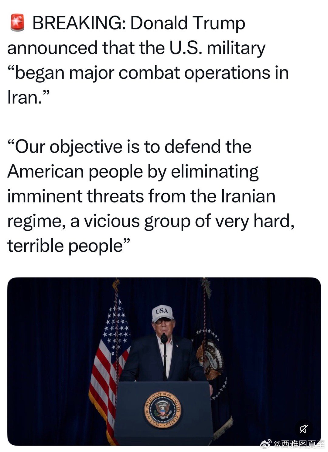 美国总统声明:是自卫,伊朗是美国的敌人,不能让他们拥有核武和能袭击美国的导弹,美国会消除隐患、推翻伊朗现政权