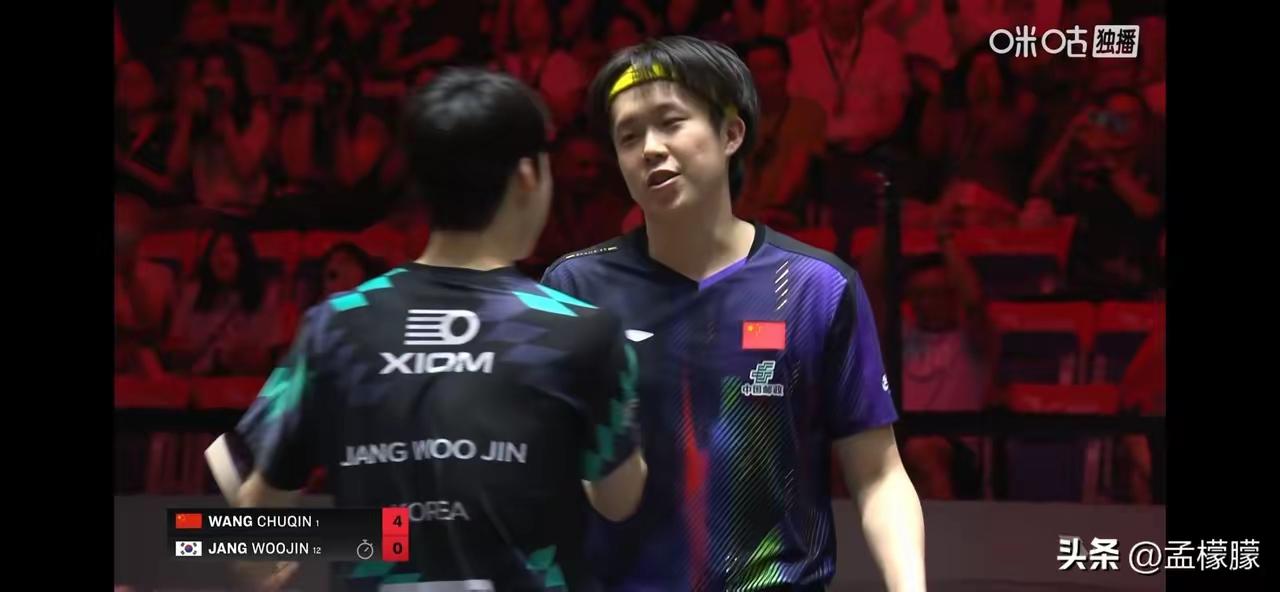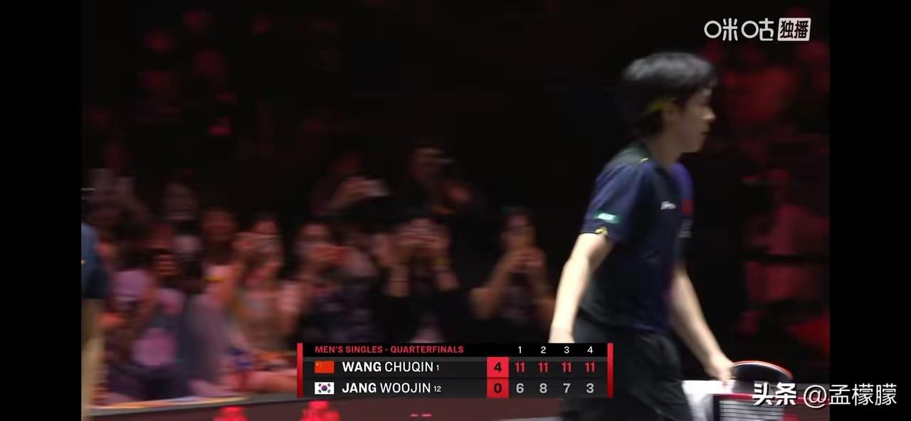 祝贺王楚钦4:0战胜张禹珍,晋级四强 四局比分: 11-6,11-8,11-7,11-3 第四局开局,张禹珍身体出现不适,申请医疗暂停,比赛一度中断。 比赛继续,王楚钦丝毫未受影响,回到赛场,状态极好;张禹珍,无心恋战,失去战斗力… 王楚钦以4:0取胜,强势晋级四强争夺战。 新加坡大满贯,王楚钦一路过五关斩六将,越战越勇。 特别是经历与林德的鏖战,心理强大的惊人。 王楚钦,精湛的球技,灵活的战术,坚定的意志,强大的心理,加上之前有多次获得大满贯冠军的自信…夺得本届冠军,非他莫属! 祝贺王楚钦晋级四强,为国争光,捍卫国乒荣誉,非你莫属! 乒乓王楚钦 赛场雄狮王楚钦
