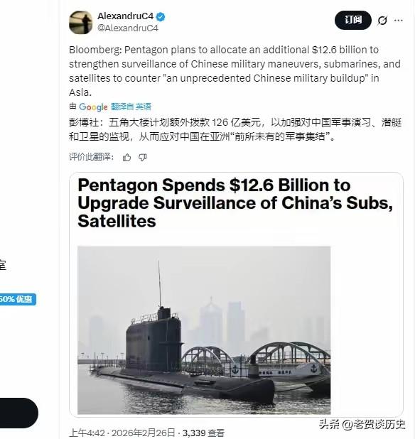 就在刚刚,美国对中国下重手,作出一个重大决定!根据美国媒体彭博社今天(2月26日,周四)所刚刚披露的最新消息,五角大楼计划额外拨款126亿美元(约人民币860亿元),以加强所谓的对“中国军事演习、潜艇和卫星”的监视,从而应对所谓的“中国在亚洲‘前所未有的军事集结’和‘军力构造’”。 这126亿美元,赤裸裸地把美国的底裤给扒了个干净。什么叫“贼喊捉贼”?这就是全球独一档的现场表演。 Pentagon那帮人现在满眼都是中国军舰下饺子、卫星上天、潜艇入海的画面,急得像热锅上的蚂蚁,恨不得把钱当纸烧,企图织一张密不透风的“天网”把咱们给罩住 。 看看这笔钱要拿去干什么吧。10亿美元砸给进攻性网络行动,10亿美元喂给神秘的空天战机X-37B,还有5亿多去扩建那个叫“沉默巴克”的间谍卫星星座 。这名字起得挺文艺,干的却是盯着别国航天器、琢磨着怎么让对手“失明”的脏活 。美国这是要把太空当战场,把海底当后院。 五角大楼还惦记着往黄海、东海、南海这些咱们的家门口扔海底传感器,甚至宫古海峡、巴士海峡这些关键水道也不放过 。他们嘴上喊着“航行自由”,心里盘算的却是怎么把海底变成透明的鱼缸,时刻盯着咱们的潜艇出没。这手伸得,未免也太长了点。 外交部发言人毛宁把话挑明了:你美国这就是打着“中国威胁”的幌子,给自己在亚太的军事扩张找借口 。这种把戏,周边国家谁看不透?大家要的是和平发展,不是美国大兵和间谍船在家门口晃悠带来的火药味。 实际上,美国才是全球最大的“军力构造”者。他们军费比后面十几个国家加起来还多,军事基地遍布全球,航母战斗群四处游弋。现在倒打一耙,说中国在家门口搞防御是“前所未有的集结”,这不是睁眼说瞎话吗?典型的只许州官放火。 咱们得看明白,美国这126亿美元买不来它的“安全感”,反而暴露了它深入骨髓的战略焦虑。他们越是在侦察监测上加码,越说明他们对中国崛起的心虚和无力感。这种歇斯底里的投入,只会把地区局势推向更危险的军备竞赛。 不过话说回来,这也给咱们提了个醒。豺狼来了有猎枪,既然美国这么“关心”咱们的一举一动,那咱们的演习就该更贴近实战,潜艇就该潜得更深,卫星就该飞得更稳。让他们的126亿,每一分钱都打水漂,每一张网都形同虚设。 各位读者你们怎么看?欢迎在评论区讨论。 中美 中美走向预测 红包封口贴 中美联合申明 美国国防大动作 美国大动作 硬核数据看美国