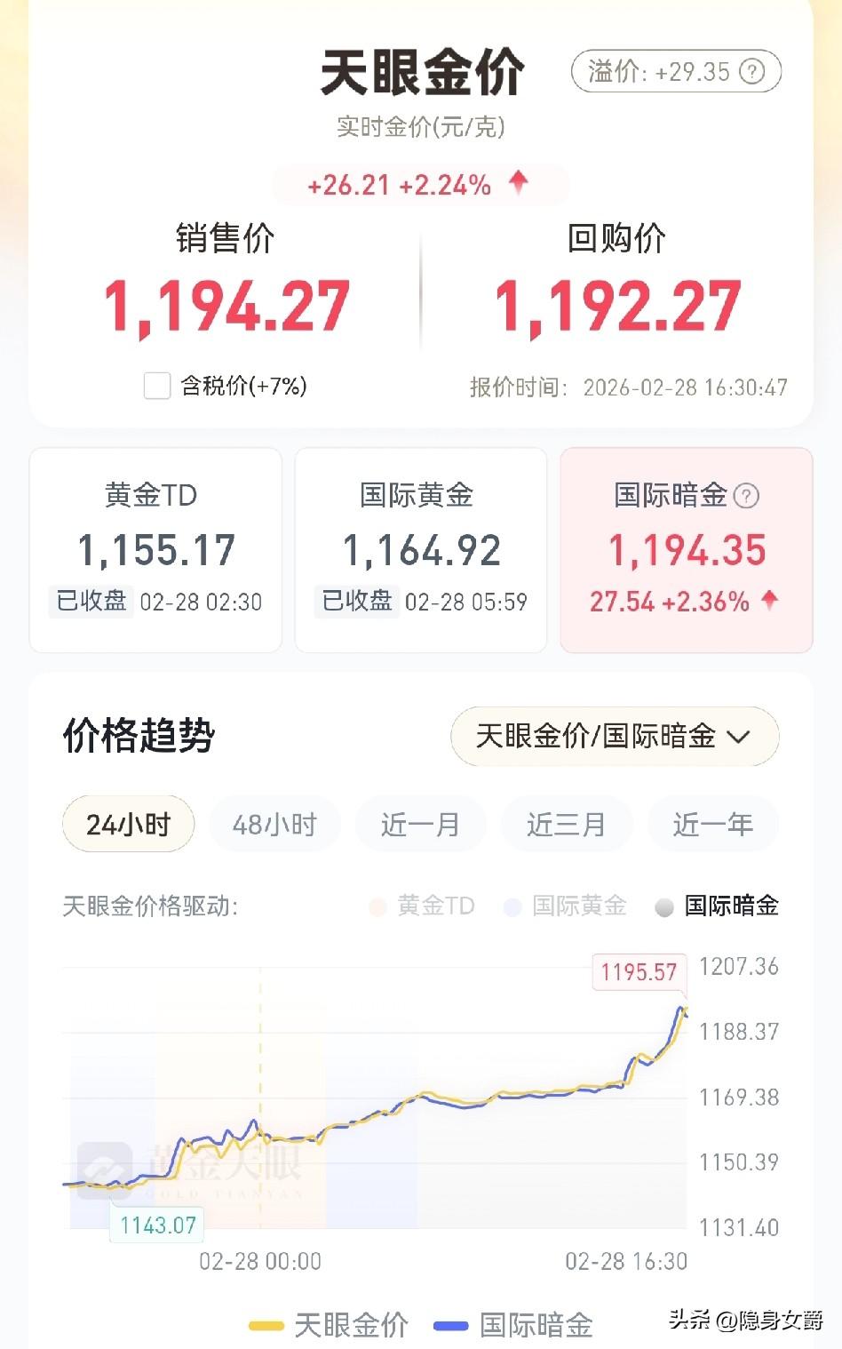 天呐! 周末黄金价格直逼1200了啊! 这个节奏能保持到周一晚上吗?春节期间黄金大涨,也是国内休盘,这次又搞个周五晚上开始疯涨,这让我们干着急啊! 周一如果来个疯涨后的大跳水,那我们可是眼巴巴看着别人吃肉,要不上交所和各银行加个班?给我们套个现[大笑]。 还有明天一天,撑住,可别跌了,等等老妇,哪怕就1194元横盘这也行。