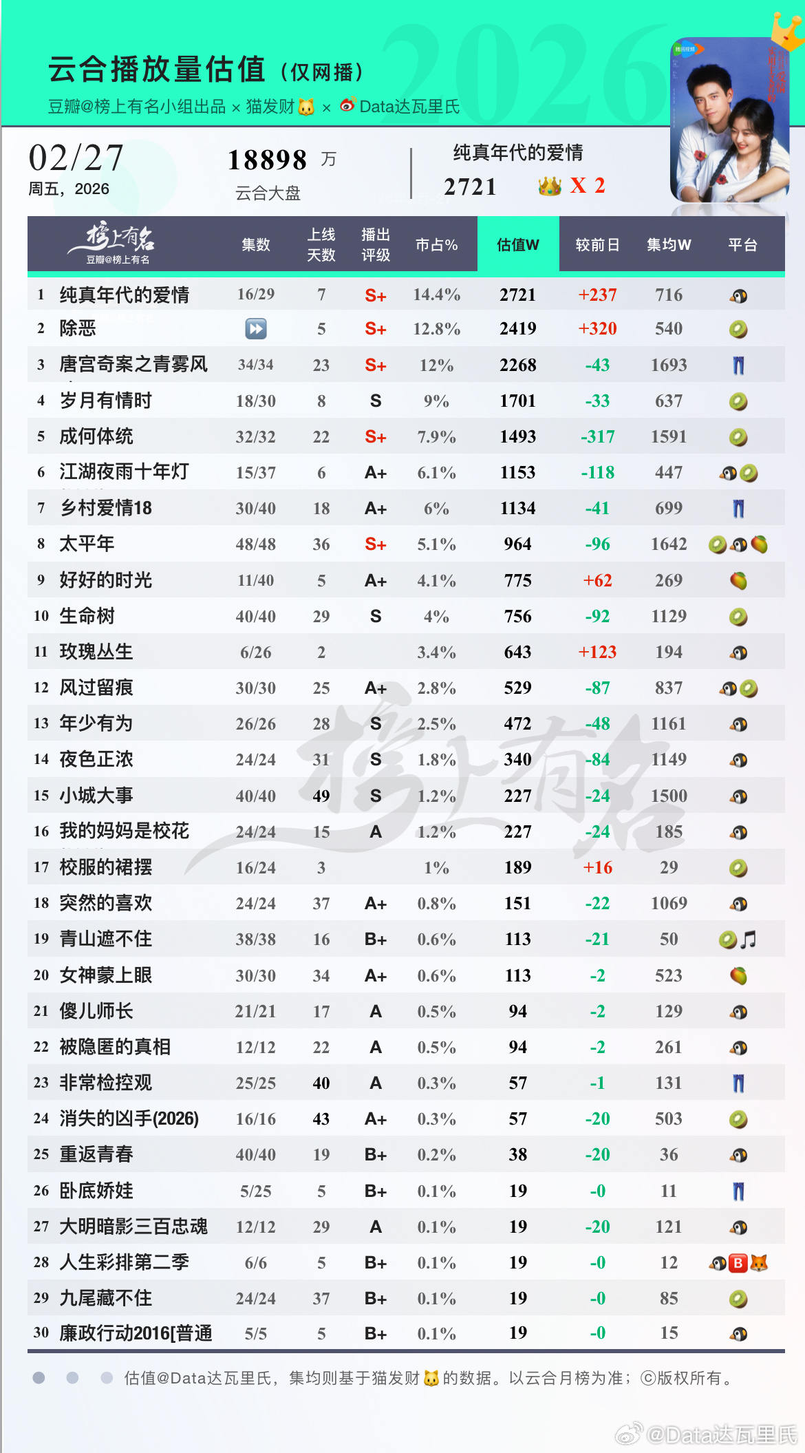2.27云合估值1纯真年代的爱情云合登顶👑×2+2372除恶