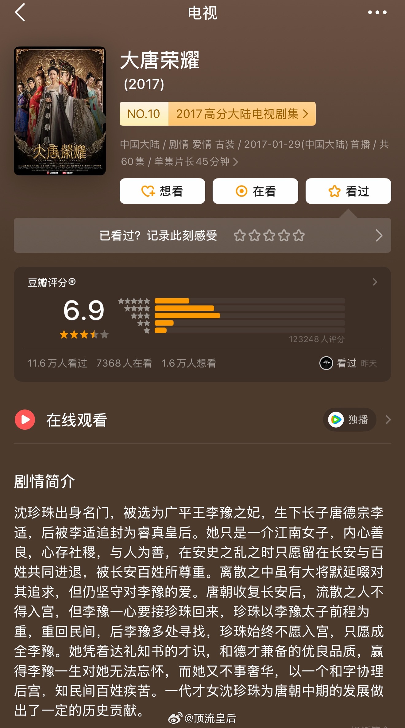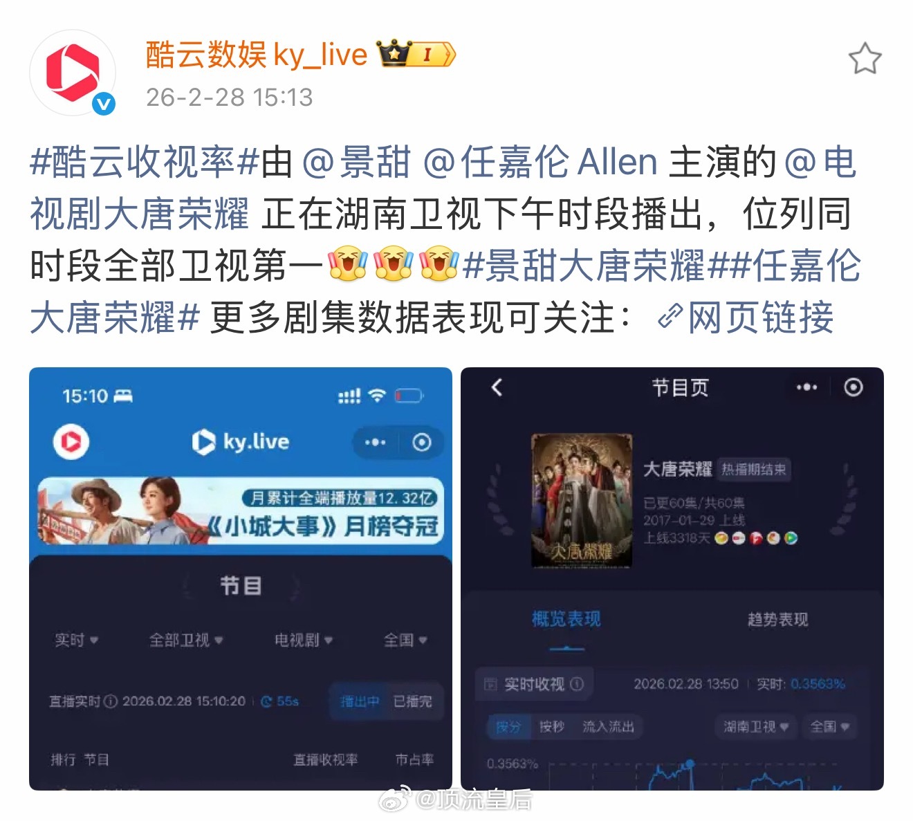 景甜、任嘉伦主演的大唐荣耀是17年的剧啊,播出这么久了,还能在湖南卫视下午档拿下同时段全部卫视第一,这是真厉害真长尾啊。