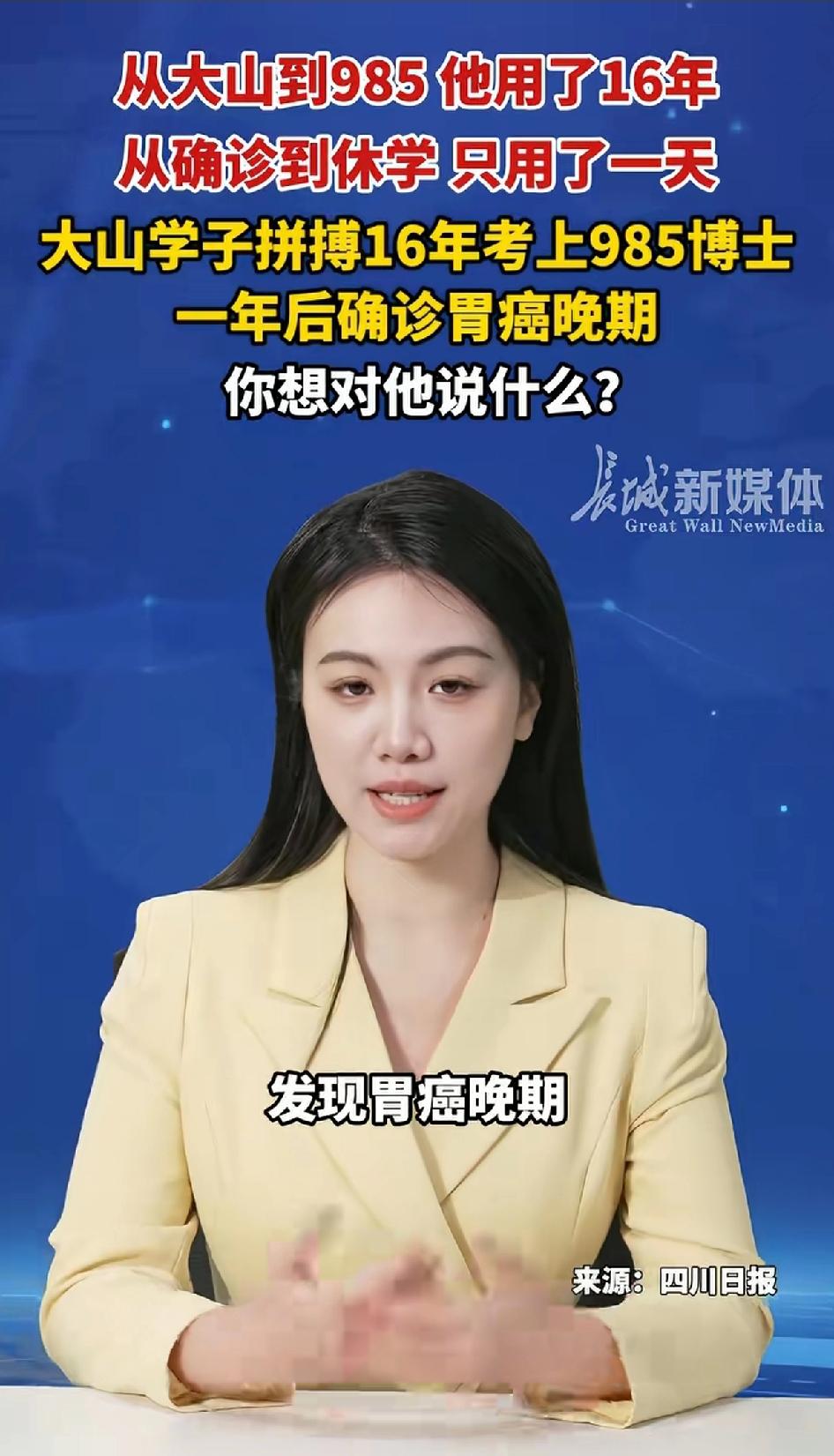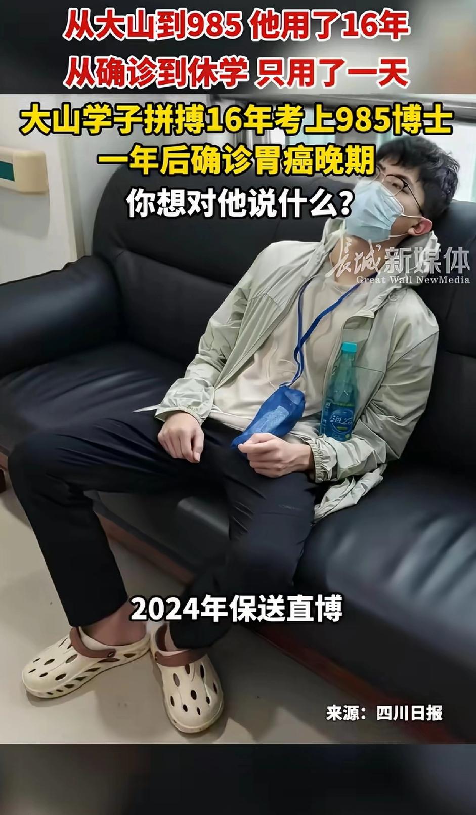 从大山到986他用了16年,从确诊到休学 只用了一年。大山学子拼搏16年考上985博士,一年后确诊胃癌。 23岁的张睿,从云南大山到985高校,他用16年完成了人生的逆袭。650多分考进中山大学,本科后又顺利保研直博,未来一片光明。 张睿的家在云南昭通市巧家县农村,父母都是农民。为了给张睿更好的教育条件,父母早年便到昆明打工,带他在昆明上小学,之后张睿回到老家继续求学。母亲在医院做杂工,父亲在工地干体力活,夫妻俩靠着辛苦劳作,支撑着家里的开销和张睿的学业。 寒门出贵子,命运弄人,研一下学期,他先是胃胀,后又腰痛,确诊时已是胃癌晚期。从健康到休学,仅仅一年。为了学业,他作息不规律,忽略了身体发出的信号。 2月27日,张睿在接受记者采访时表示,2020年他以650多分的高考成绩考入中山大学,2024年本科毕业后成功保研,开启五年直博学业。2025年7月,他出现胃部发胀、进食困难,同时伴有腰痛症状,就医检查后被确诊为胃癌晚期。目前,他已接受十多次化疗,身体因此急剧消瘦,体重一度下降30多斤。所幸经过大半年的治疗,他的病情已暂时趋于稳定。 张睿坦言,进入大学后,自己生活作息不规律,吃饭更是饥一顿饱一顿,每次错过食堂饭点,只能在外购买食物。压力和不良情绪可能成为疾病的诱因。 此外,他的外婆曾患甲状腺癌,母亲肠胃长期不好,虽未确诊癌症,但家族病史可能使其存在一定的患癌风险。 如今,他已接受十多次化疗,治疗过程十分艰难,化疗药物对胃肠道带来强烈刺激,让张睿一度无法进食饮水,喝下的水很快就会呕吐出来。在前两次化疗中,他甚至出现了呕血、尿血的症状。 学校师生和网友纷纷伸出援手,这场重病,不仅让张睿承受着巨大的身体痛苦,也让这个普通家庭背负了沉重的负担。 张睿父母介绍,为给儿子治病,至今已花费30余万元。母亲一直在医院悉心陪护,父亲最初也放下工作全心照料,等张睿病情稍有稳定后,便赶回云南工地打工,竭尽全力筹集治疗费。张睿的父母表示:不放弃一丝希望。张睿盼着战胜病魔回校,这一路的艰辛,让人感慨命运无常,也希望他能挺过难关。 看到这个消息,想到两年前刚毕业的表弟,大学毕业刚参加工作两年,跟新闻里的男主角年龄相仿,也是出身农村,不过表弟的家庭条件比他更差,表弟从小失去母亲,是妈妈帮舅舅抚养长大。 表弟年纪轻轻患上骨肉瘤,家人悲痛不已,表弟走的很不甘心,不理解越来越多的癌症盯上了年轻人。 父母辛苦供出来的学生,即将参加工作的年轻人突然患上绝症,家人怎么能接受?舅舅和妈妈看到表弟哭了又哭,短短几个月的时间,癌症带走了表弟,妈妈整夜睡不着觉,血压升高,轻微脑梗伴随着她。 眼睛里含着泪,每次电话联系那边传来重重的鼻音。表弟走了,爸爸带着妈妈去医院输水。 因为难过,妈妈已经很少去舅舅家了,妈妈说她忘不了表弟,去舅舅家就会想到他,妈妈看到舅舅更难过,舅舅的儿子死了,又是自己费心费力抱有期望的侄子,就这样被病魔轻松的带走了。我们只能安慰妈妈这一切都是天意。