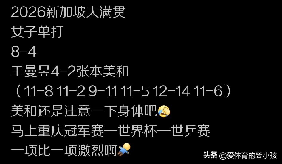 在国乒名将王曼昱和日本年轻新星张本美和之间,谁的实力更强?当然大家都能形成基本的共识,那就是王曼昱要比张本美和的能力高出半个档次。 但每次两个人交锋,虽然王曼昱轻松取胜的次数不少,但随着时间的推移还有张本美和的不断进步,双方的比拼也是越来越给人一种仍能胜出,却越打越艰苦的感觉。即使有时候能相对轻松的胜出,但接下来再进行对决时,张本美和也总能找出一些突破点来争取在在王曼昱面前有更出色的表现,也给王曼昱制造更多的难题。 这次新加坡大满贯赛的赛场上,两个人在女单8进4的争夺战当中迎来正面对决。王曼昱又是在比赛一上来11:8、11:2先赢两局的形势下,后面被张本美和依靠关键分能力11:9扳回一城。即使王曼昱依靠节奏和进攻质量方面的提升,11:5,再下一城,张本美和还是能打出韧性,依靠王曼昱的关键失误14:12。继续拿到一局比赛胜利,不过后面,王曼昱并没有慌乱,而是继续稳扎稳打,再以11:6的比分赢下关键的第六局,也确保自己在这场有点困难的比拼当中,拿到了一场4:2的最终胜利,也确保自己拼下一个女单的四强席位。 值得一提的是,这次的新加坡大满贯赛上,王曼昱确实在赛程方面遇到的困难和压力比较大。比如她一开始就打中国台北一姐郑怡静,依靠正手的发挥确保了比赛中的胜出。而后面她也遇到了韩国一姐申裕斌以及日乒一姐张本美和,而下一轮比赛当中也就是在战胜张本美和之后,半决赛的比拼中,王曼昱将迎来欧洲新科女单冠军沙宾温特的挑战。 沙宾温特作为一个1992年出生的老将,这次在新加坡大满贯赛上也确实表现惊艳,不但前面4:2赢了朱雨玲,还在拼下朱雨玲这种高手之后,又在和国乒主力王艺迪的比拼当中实现了八进四争夺战里面4:2的胜出晋级。能把朱雨玲和王艺迪这种高手连续淘汰出局,可见沙宾温特当前的整体竞争力确实堪称不俗,也需要让王曼昱在和她交锋时做足更大的困难准备。 总之,这次王曼昱在新加坡大满贯赛上,可以说一路过关斩将,遇到的大部分都是实力派高手,而且各种风格的高手都有。这种交锋对她的锻炼价值也极高。我们需要看看王曼昱在后面的半决赛当中,面对沙宾温特的挑战会有怎样的发挥。当然我们相信王曼昱还是可以凭借自己的综合实力成为比赛当中的胜出和晋级者,您觉得呢?