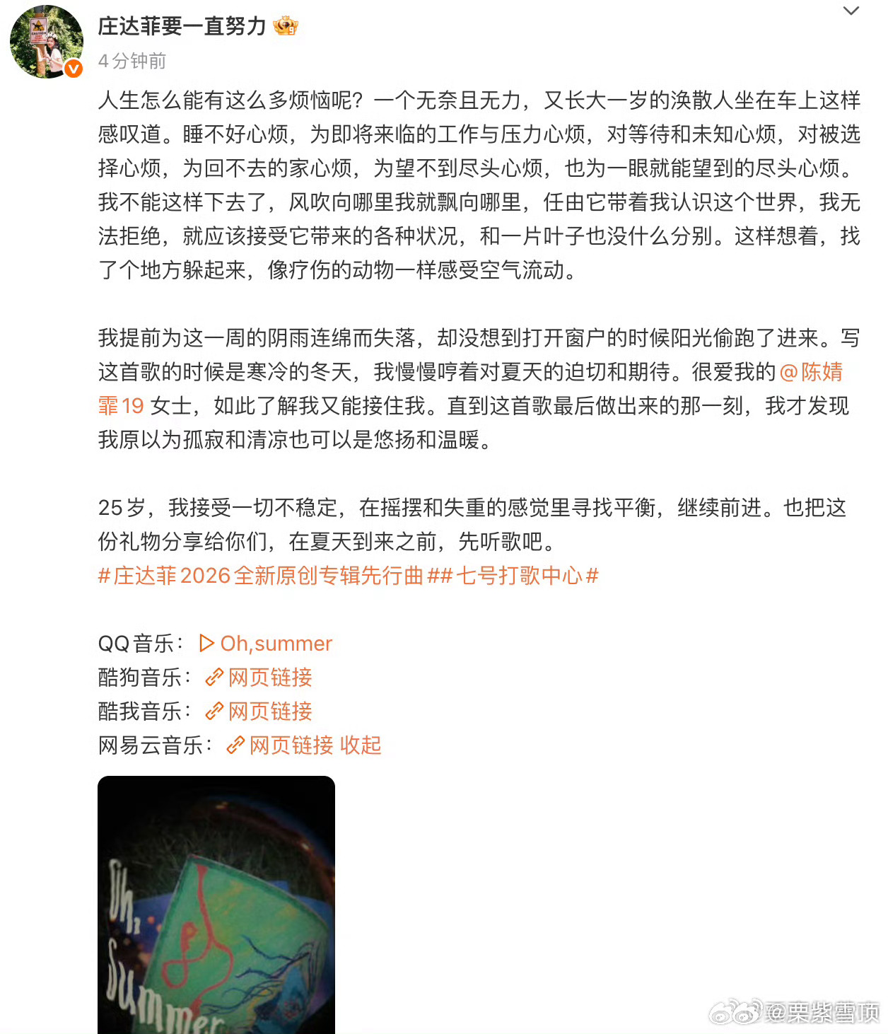 庄达菲一岁一岁到一首一首 庄达菲从15岁开始写属于自己的歌,从《候鸟的约定》、《放放》、《湘江中路》…到现在《Oh,summer》,每一首歌都见证了她的成长啊!!