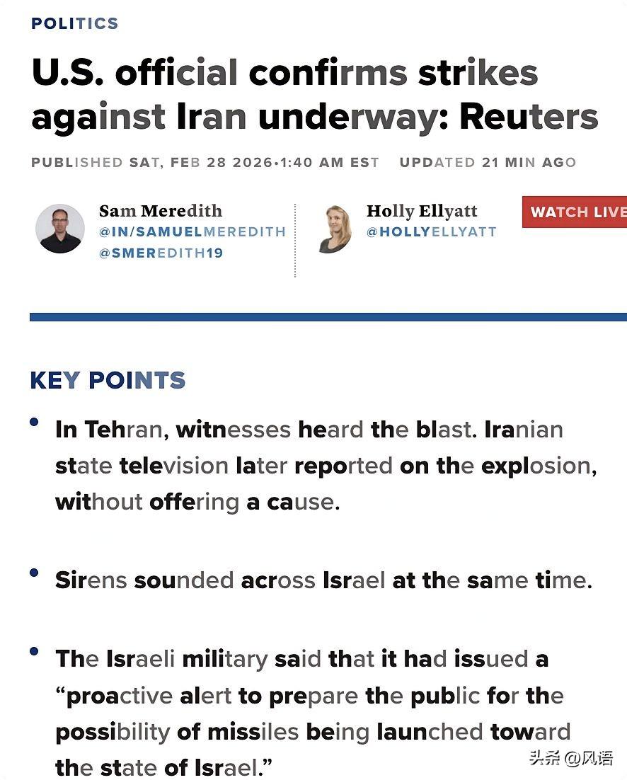 据路透社报道,美以联军开始了对伊朗的空袭,伊朗国家电视台确认了此事。相关目击者称,德黑兰多处响起了爆炸声。 美以联军至少空袭了伊朗30个目标,包括总统府、最高领袖办公室、情报与国家安全部等核心区域,以及伊斯法罕、库姆、卡拉杰、克尔曼沙赫等等。 据伊朗官方通报显示,袭击已造成78人死亡、329人受伤,其中包括武装部队总参谋长巴盖里、革命卫队总司令萨拉米等高层人员。 另据稍早前报道,伊朗革命卫队损失惨重,数十名成员死伤,包括多名军方高级指挥官。 据有关分析,这次空袭改变了此前代理人战争的性质,升级为“国家直接对抗”,伊朗方面誓言将进行“毁灭性报复”, 还有,以色列也拉响了空袭警报,不知道是遭到了报复,还是主动预警措施。但以色列目前还未有被袭报道,大概率是后者。