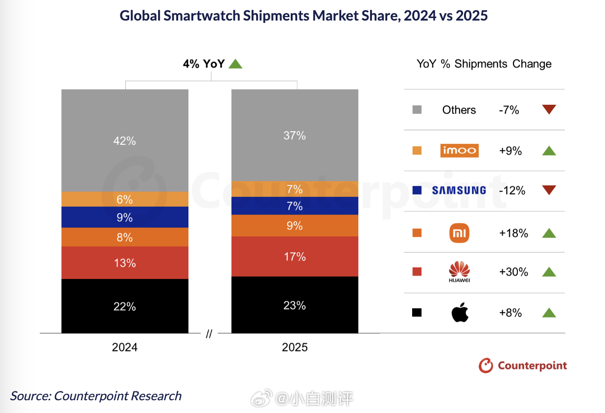 图2是Counterpoint统计的2025年全球智能手表出货量TOP5:❶苹果(23%)❷华为(17%)❸小米(9%)❹三星(7%)❺imoo小天才(7%)